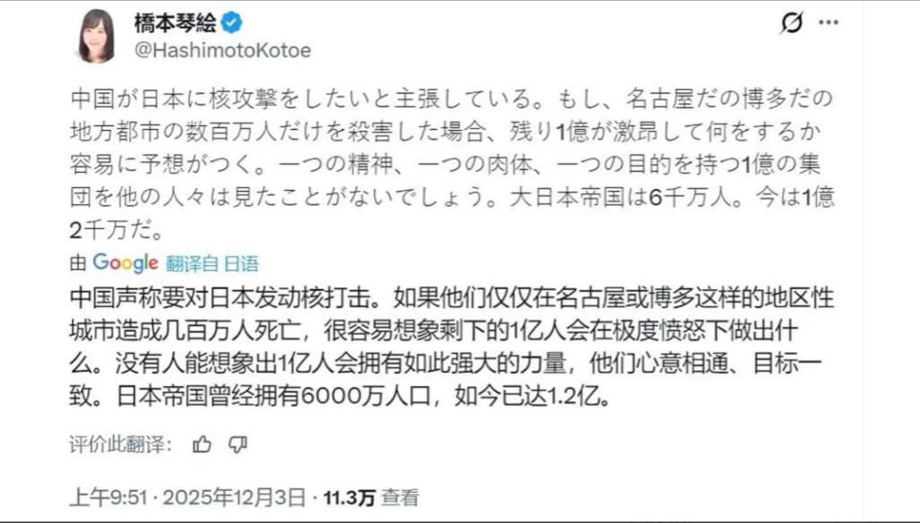 说这话的是日本右翼作家桥本琴绘,她在2025年12月初于社交平台发布这段假设性言论,点名提到名古屋和博多两座城市,声称若中国对这两地实施核打击造成数百万人伤亡,剩余一亿多日本人将形成统一意志发动全面反制行动。