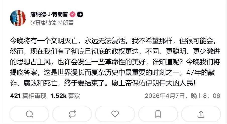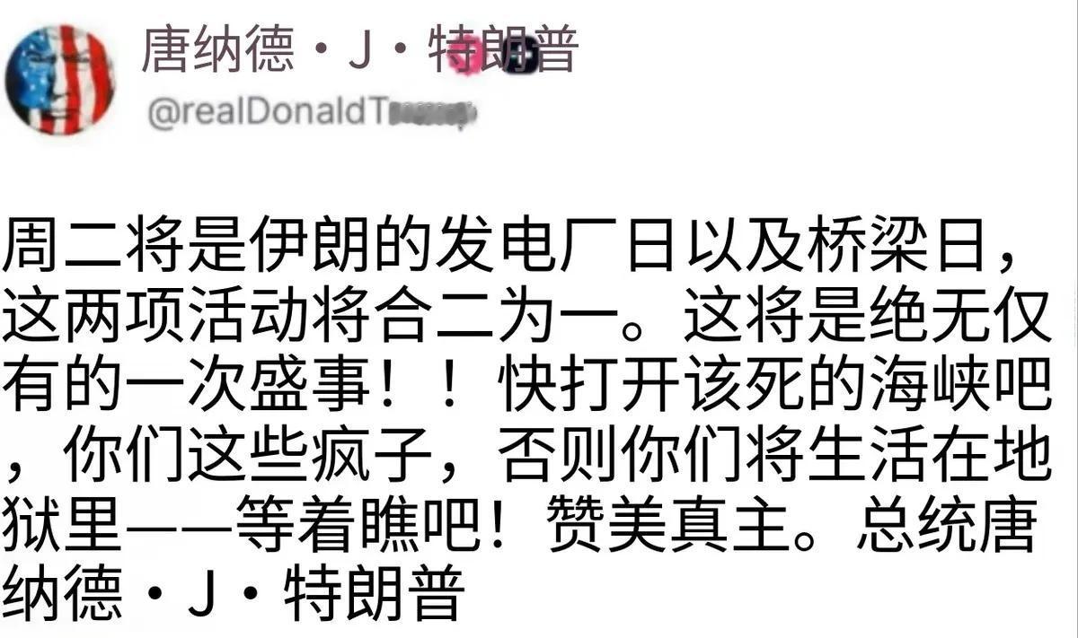 4月19日的最新外交闹剧,就是最直观的证明。特朗普公开对外官宣,美国代表团将前往巴基斯坦伊斯兰堡,参与美伊第二轮双边谈判。他对外刻意标榜,美方拟定的协议条款足够公平合理,是兼顾双方利益的最优方案。可这番看似释放谈判信号的表态过后,紧随而来的就是赤裸裸的武力恐吓。他直接公开放话,伊朗若是拒绝美方的协议条件,美军会直接摧毁伊朗境内所有发电厂、桥梁等核心民生基建,直白宣告自己不再维持温和的沟通姿态。