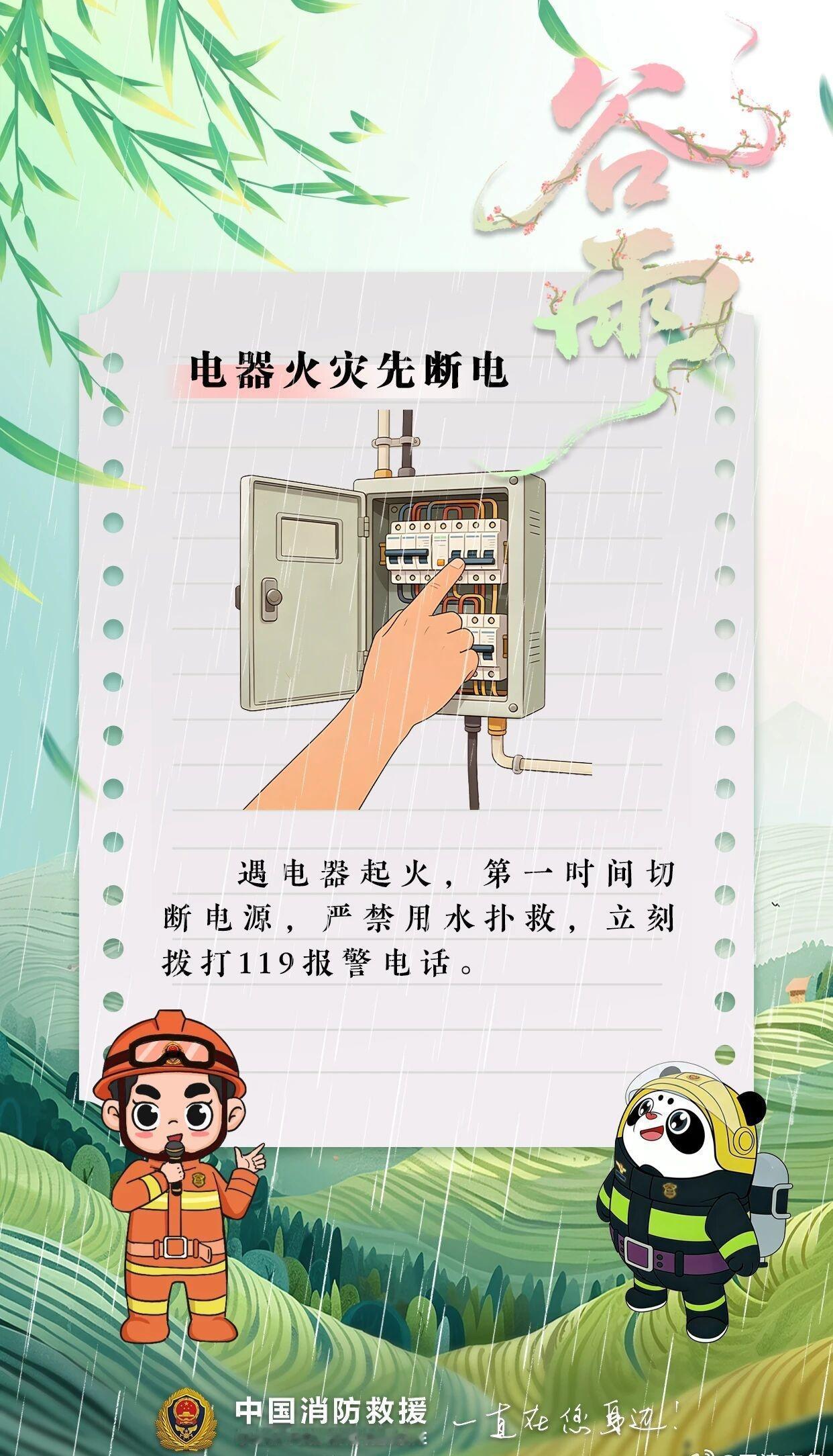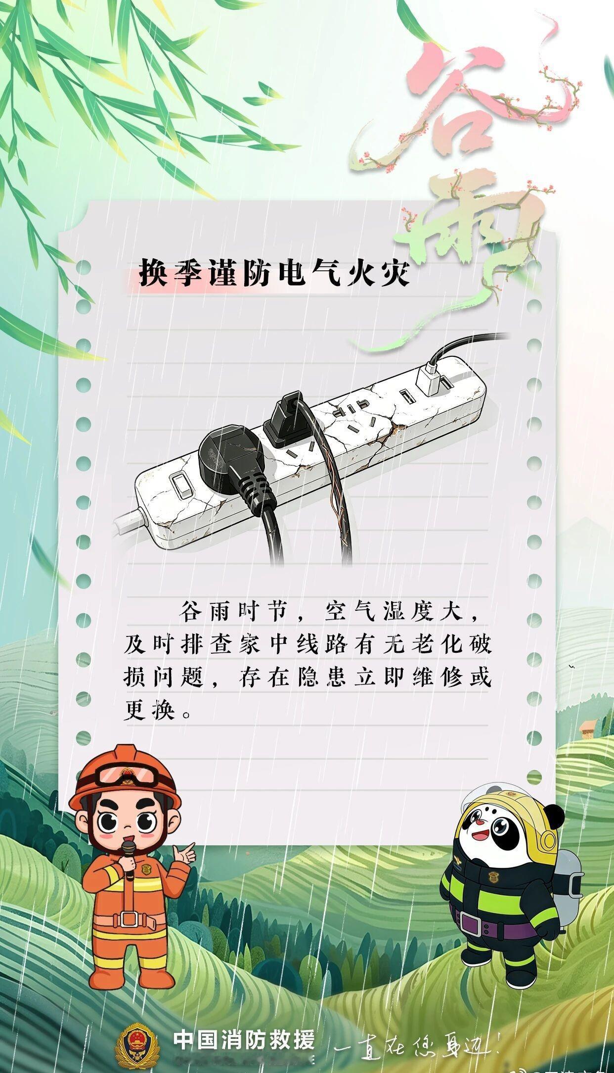 【谷雨落,春将尽,安全莫大意!】安全提示 雨润新绿,春深向晚,谷雨至,雨增多,空气湿度加大用火用电需格外留意