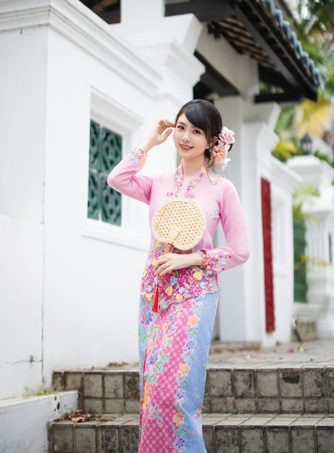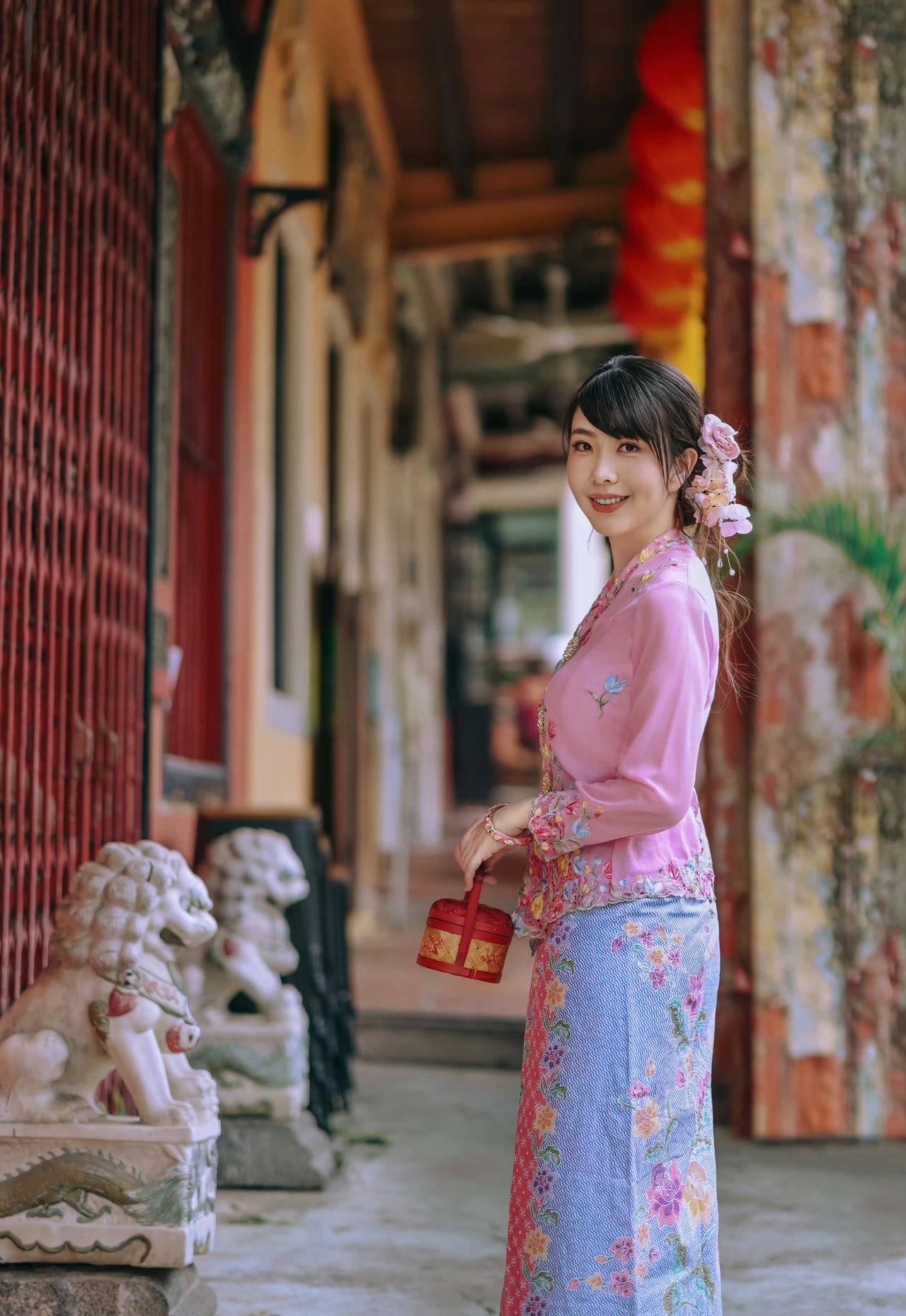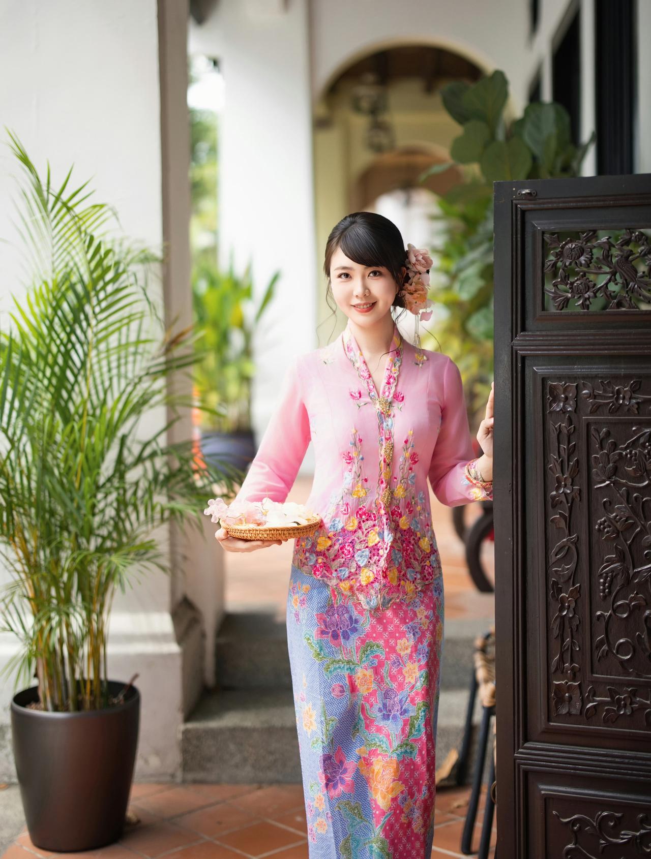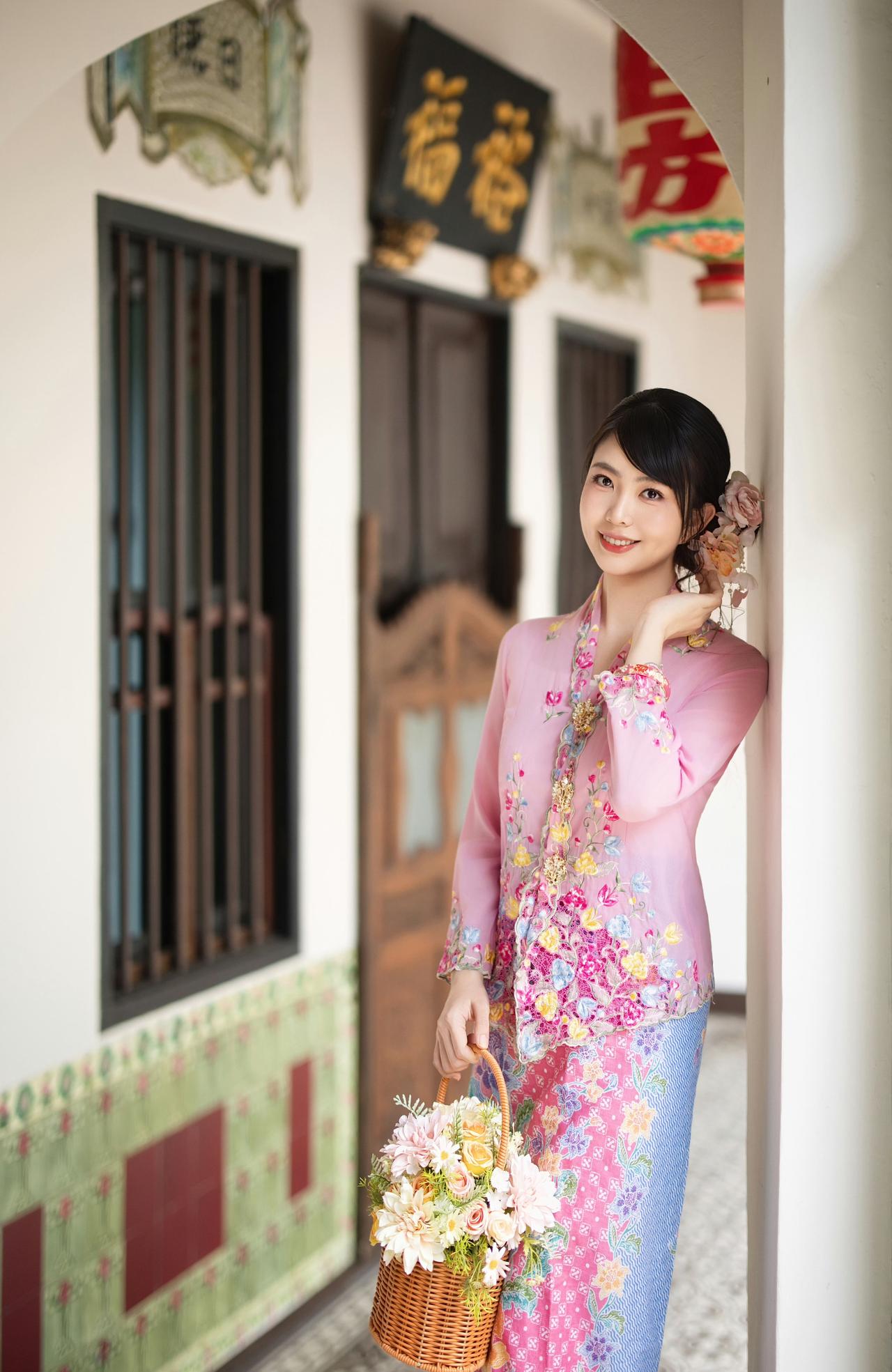 在南洋骑楼的光影里,粉色峇峇娘惹服的刺绣繁花,与古宅的雕花门窗相映成趣。 花篮