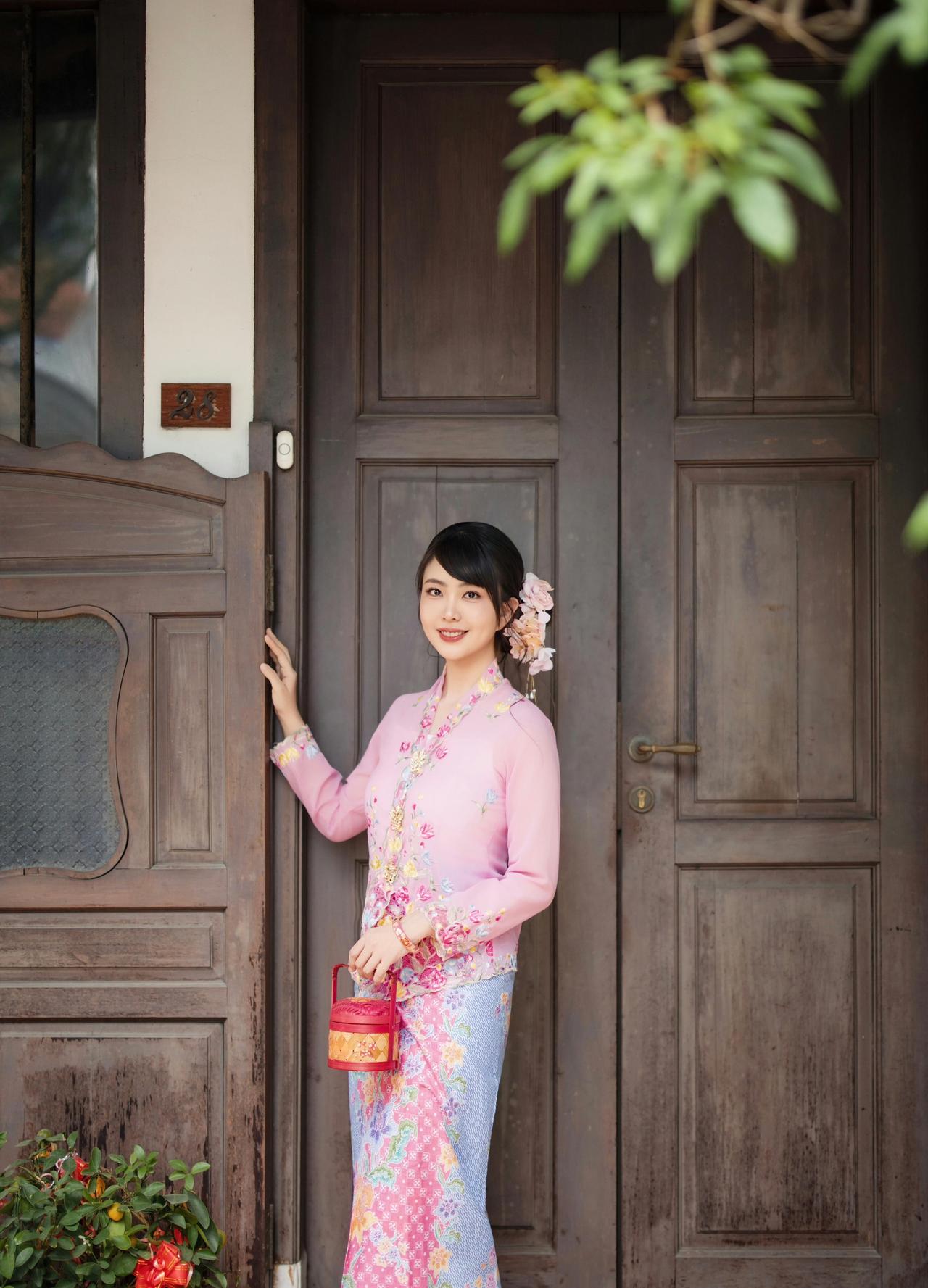 在南洋骑楼的光影里,粉色峇峇娘惹服的刺绣繁花,与古宅的雕花门窗相映成趣。
