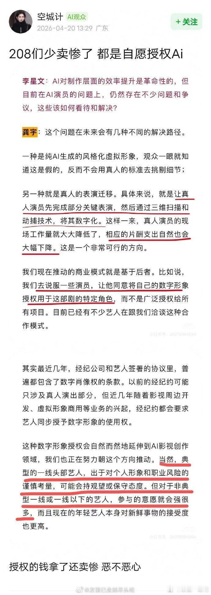 入库艺人有接洽AI影视项目的意愿平台方最新表态引热议,入库艺人们大多有接洽 AI 影视项目的想法,非一线艺人参与热情明显更高。 非一线艺人参与AI项目意愿很强