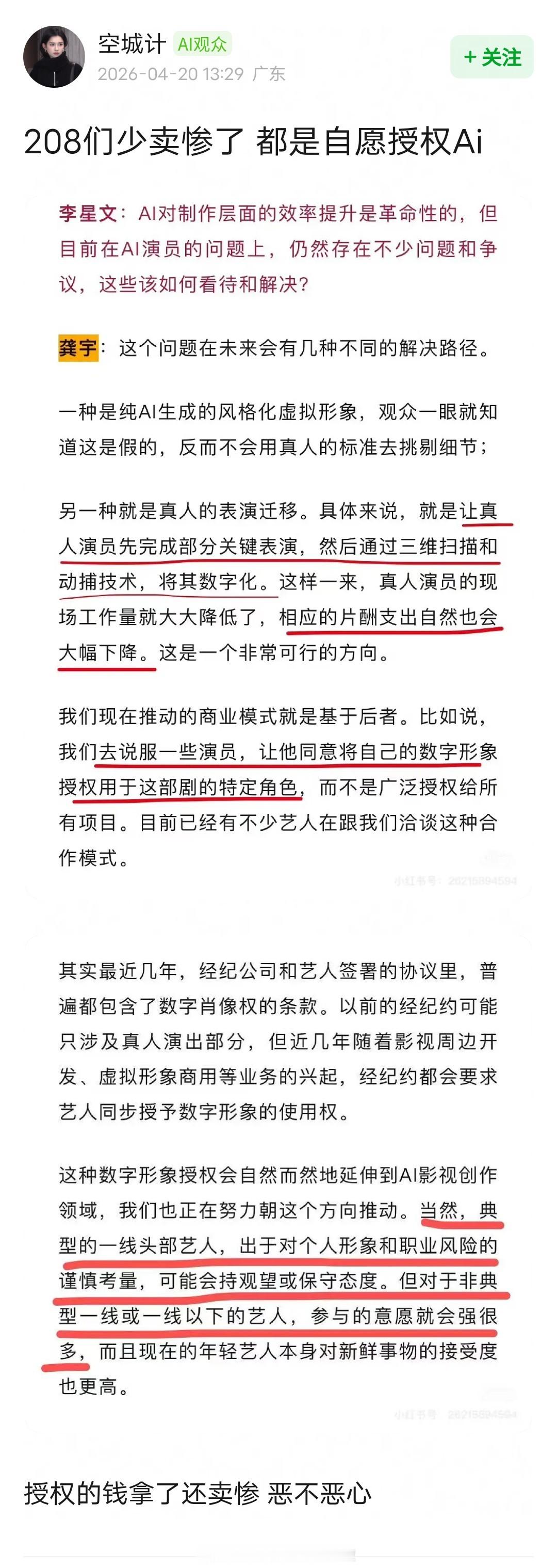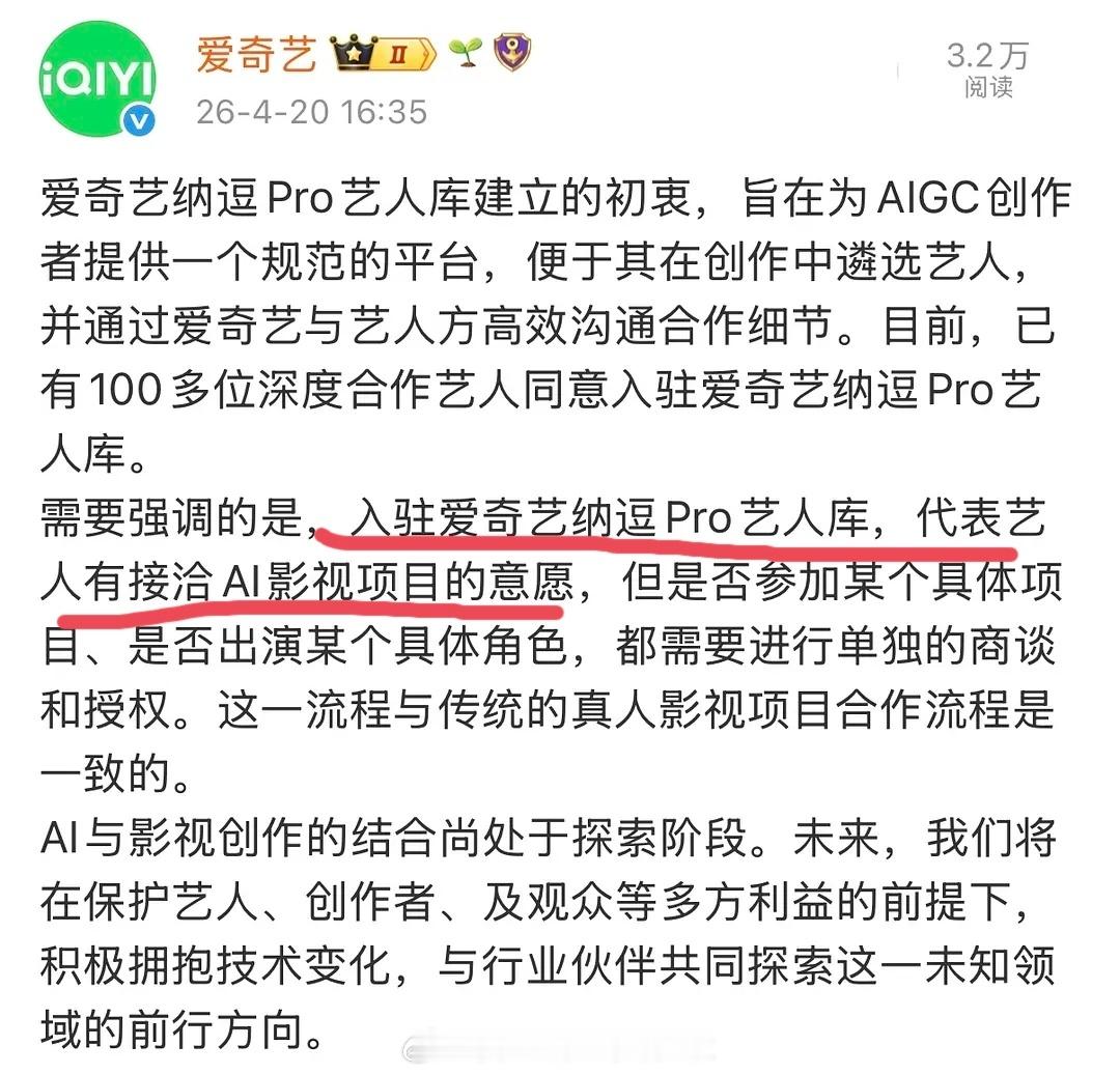爱奇艺和龚宇出来倒油了,强调入库的艺人有接洽AI影视项目的意愿,非一线或者一线以下的艺人,参与意愿很强。爱奇艺更新的艺人库名单,陈哲远、曾舜晞、丞磊知名度流量最高,粉丝之前都说他们是平台艺人,没有话语权,是被迫授权Al。爱奇艺 爱奇艺 穷疯了也得有底线低情商演员失业 高情商更多休息