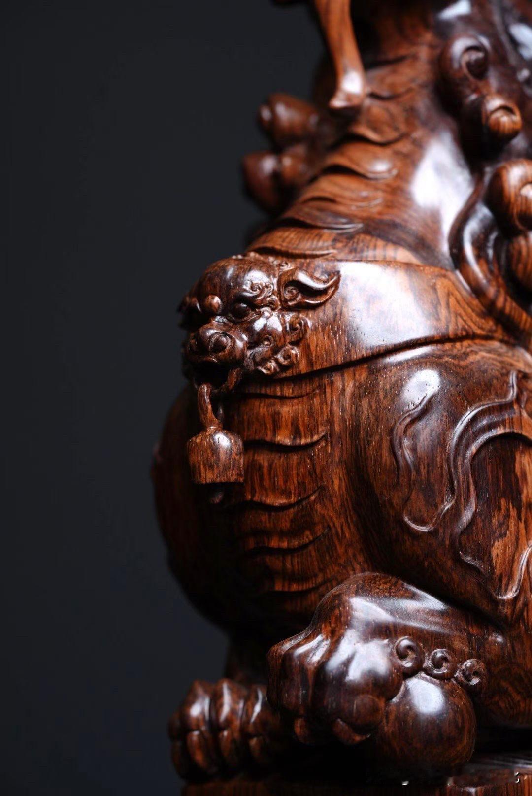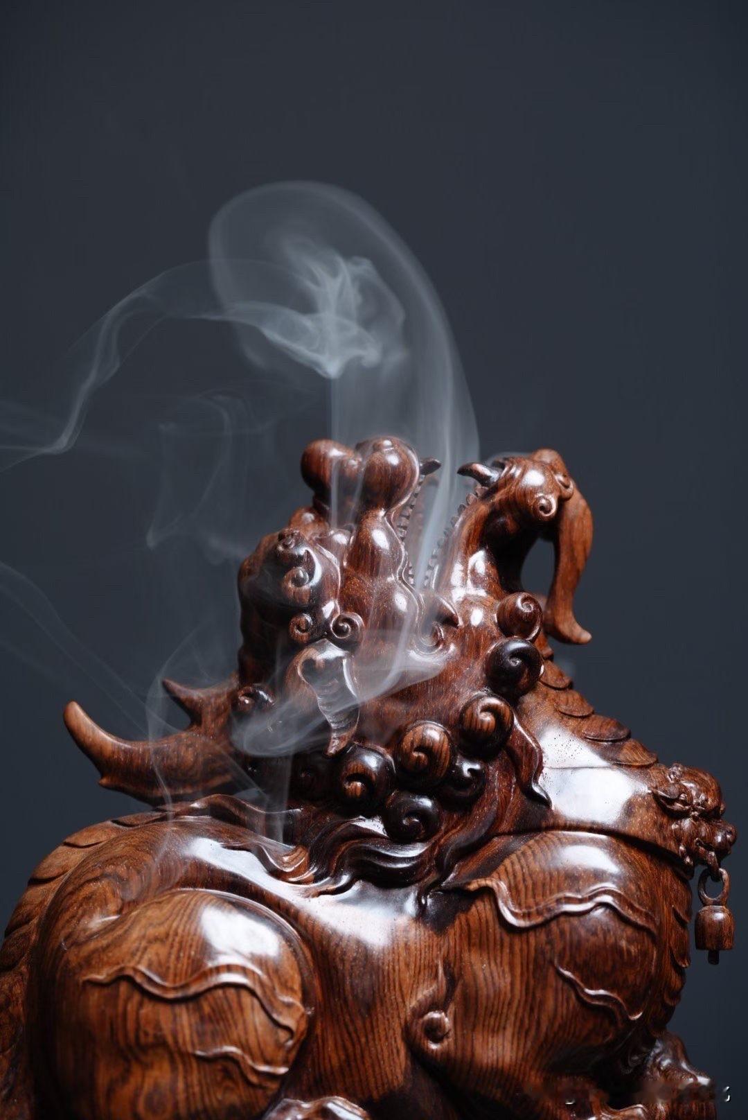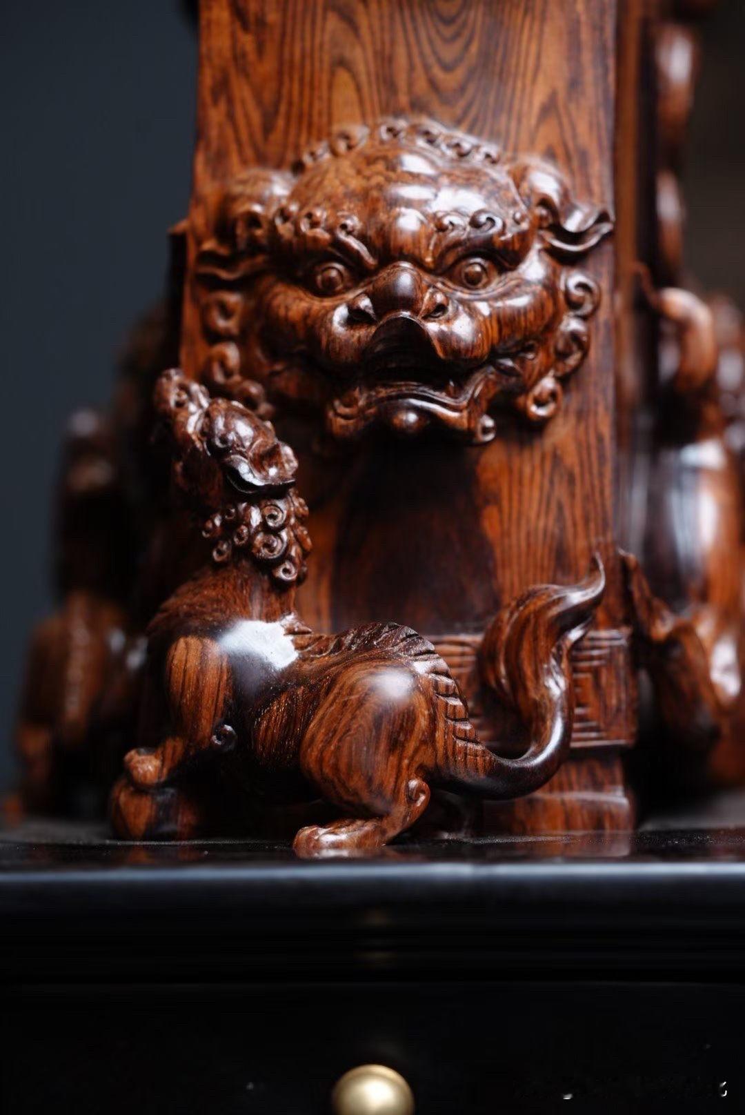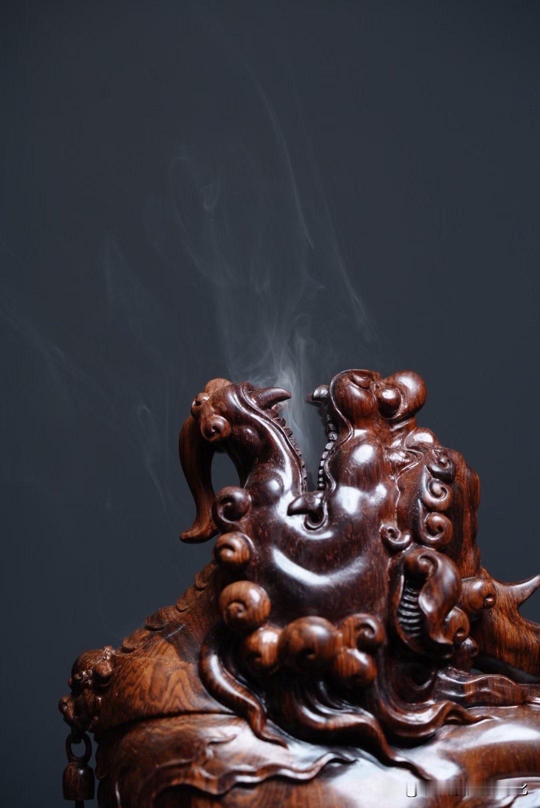黄花梨的纹理如云,光影一走,便有流动之感。狻猊昂首吐烟,气势不张,却自带一种内敛的力量。足下幼兽环伺,憨态生动,让威仪中多了一点温度。