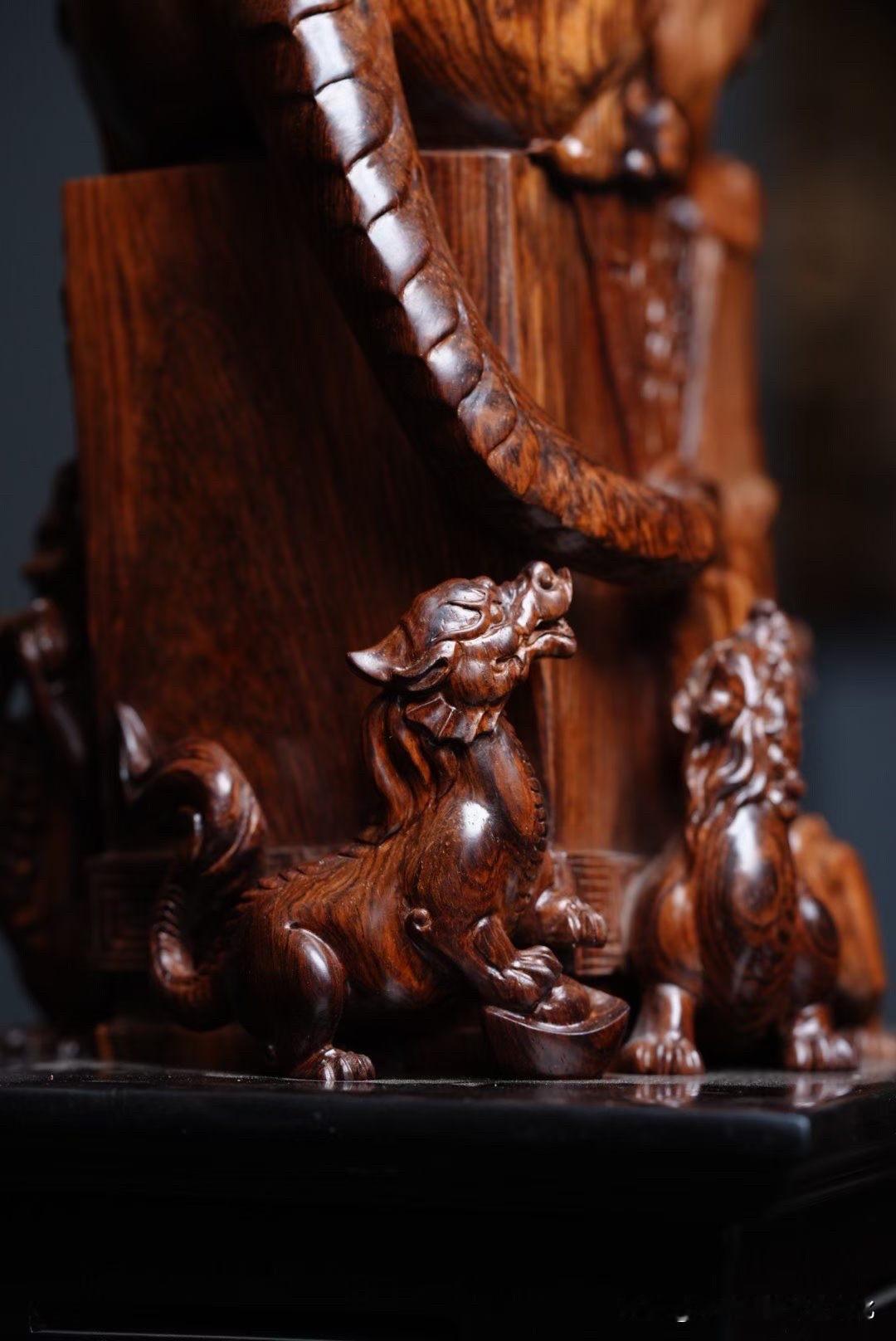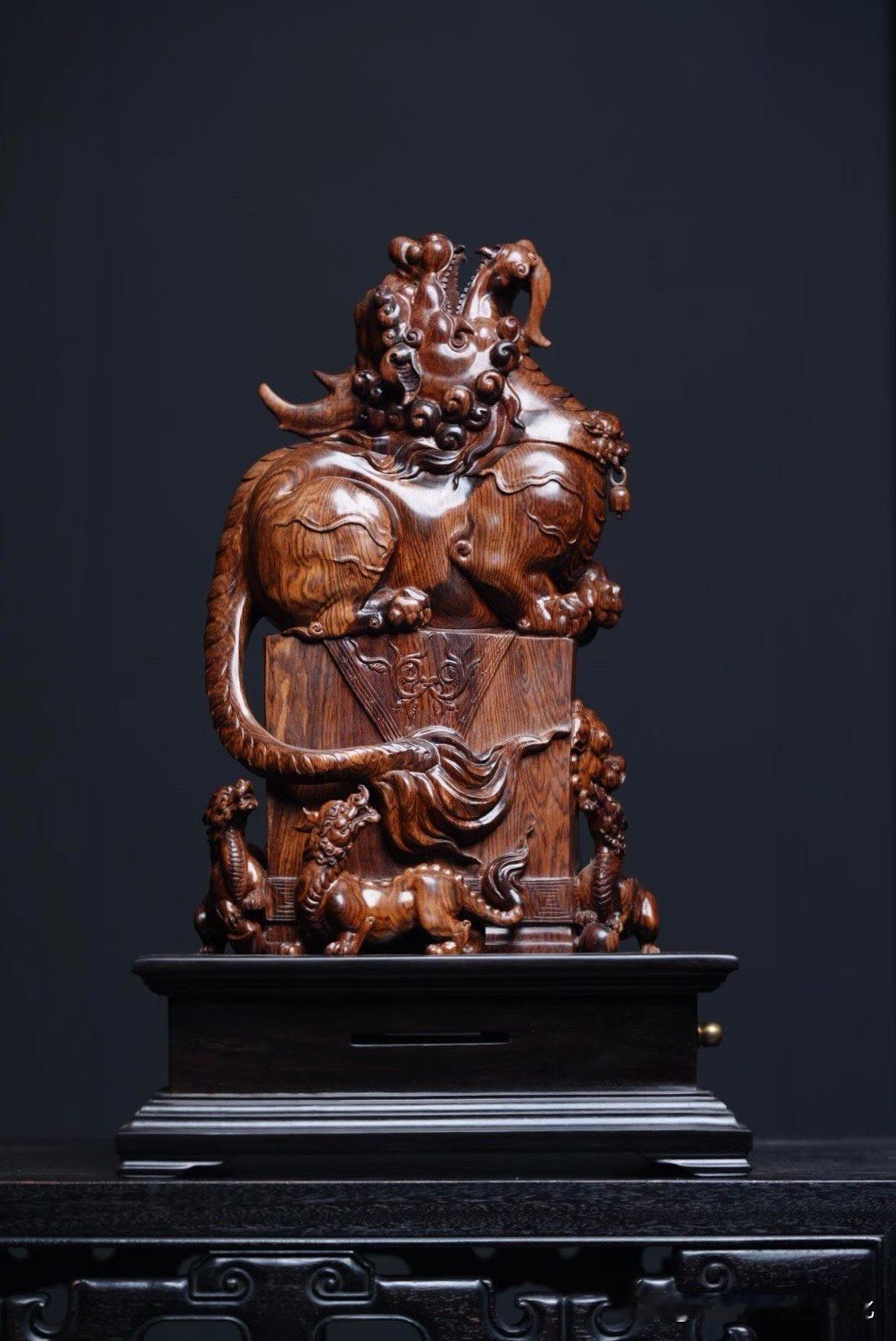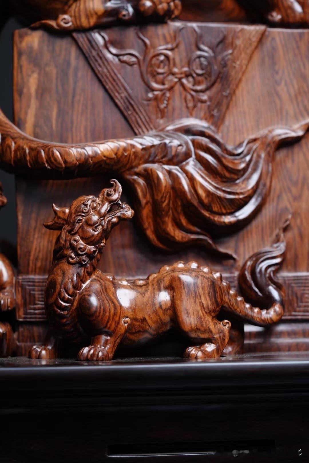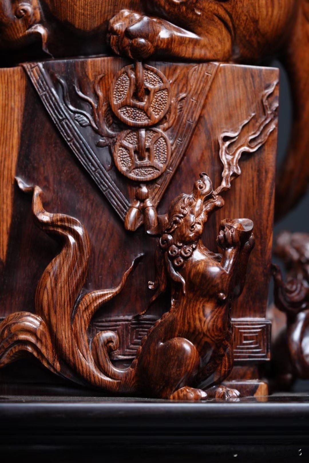 黄花梨的纹理如云,光影一走,便有流动之感。狻猊昂首吐烟,气势不张,却自带一种内敛的力量。足下幼兽环伺,憨态生动,让威仪中多了一点温度。