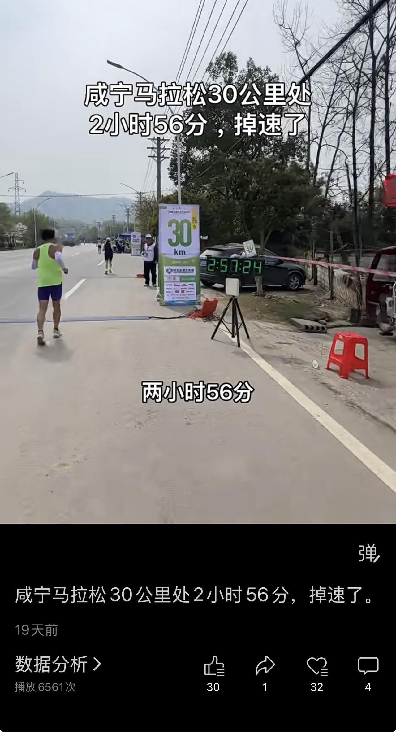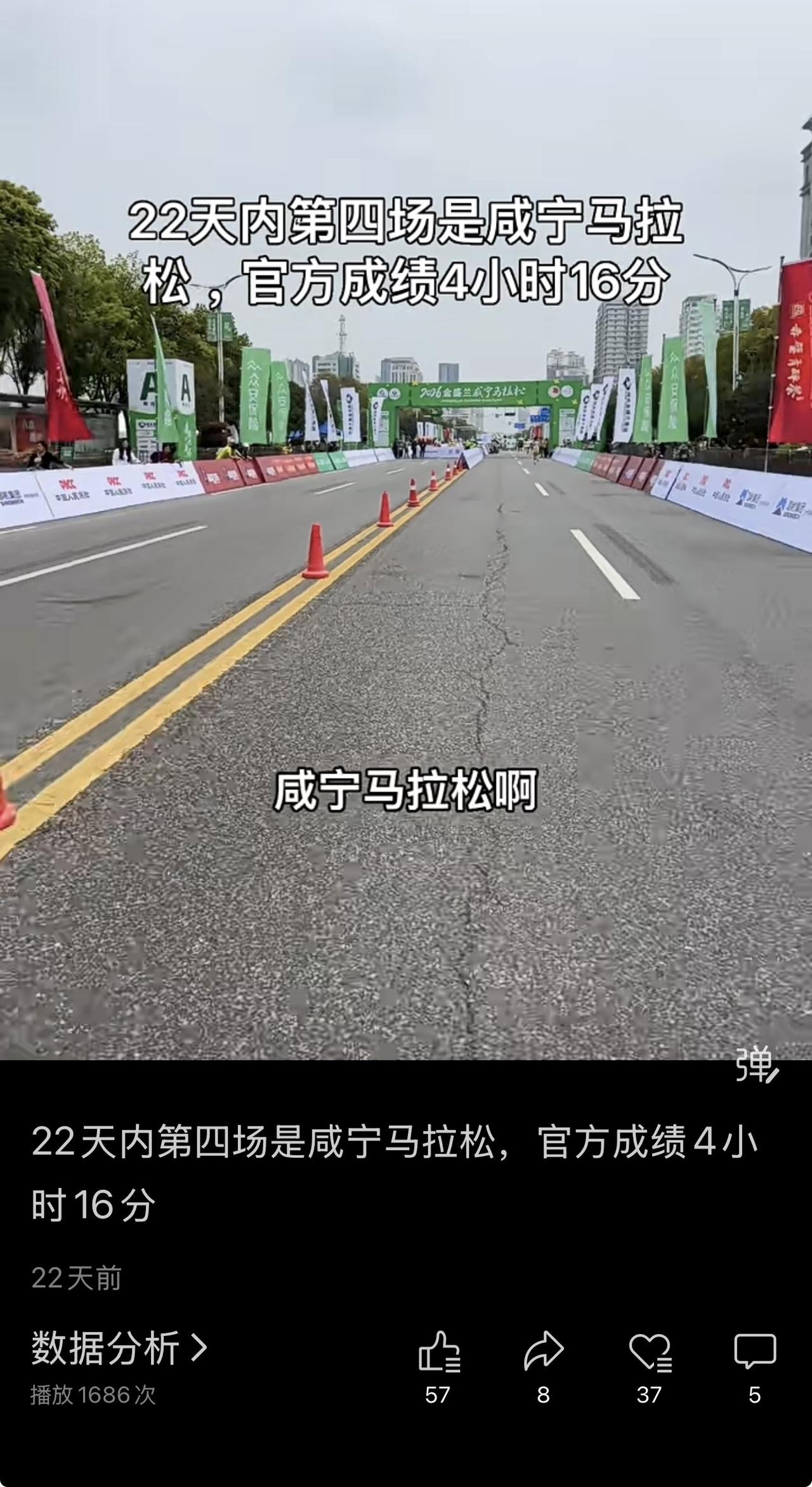 有个小插曲,我习惯边跑边发短视频,内容绝对是宣传各地马拉松特色的,每场马拉松的短视频播放量都在十万左右。在咸宁马拉松赛道上,我的短视频中出现了个意外的事情,我跑步中不久就接到组织委的电话,问我能不能删掉这条短视频。我很理解也就删掉了短视频。