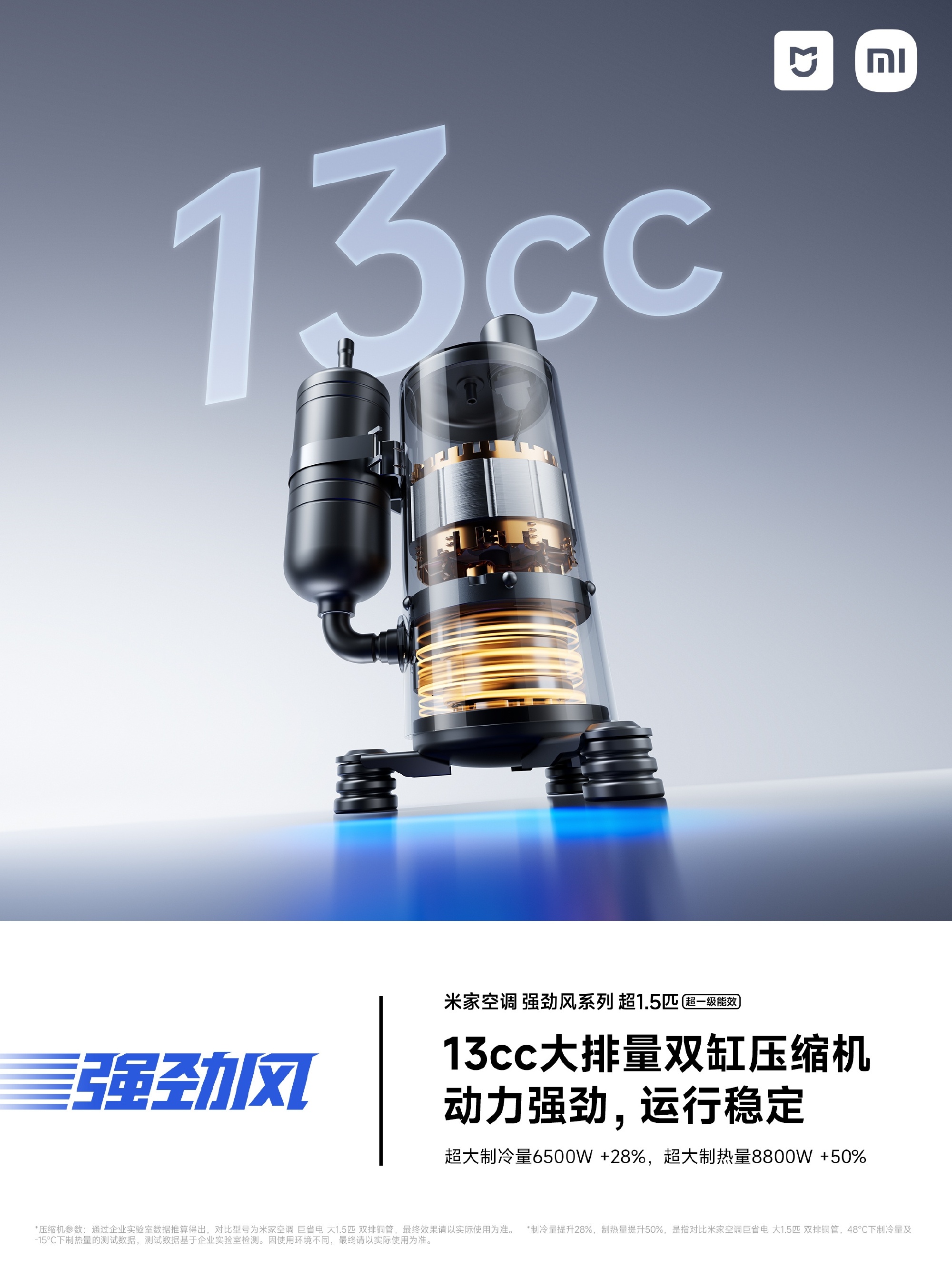 小米全新性能旗舰空调,13cc超大排量双缸压缩机加持,1000m³/h超大风量,15s速冷30s速热,全屋快速冷暖。APF6.30超一级能效AI节能超省电,纯热泵制热温和不干燥,支持小米全生态互联,10年包修放心入,3000元档性能最优解!