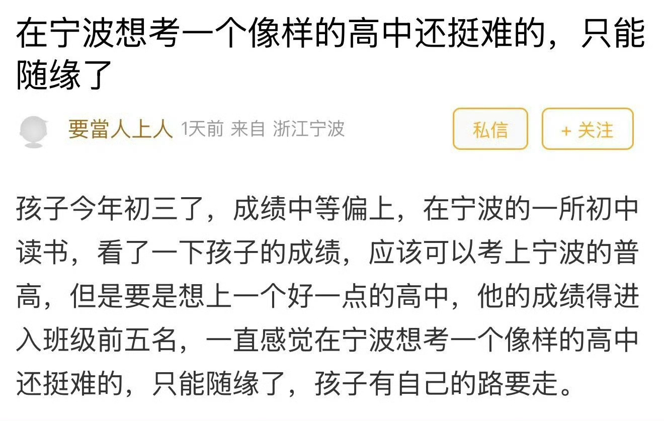 在宁波中等偏上的孩子想上个像样的高中有多难 在宁波,中等偏上的孩子,想上个像样的高中有多难?家长坦言:只能随缘2025年宁波主城区普通高中招生比例提升至75%左右,较2024年提升约9个百分点。乍看之下,这个比例并不少,全市大概3/4的学生都可以上普高。而发帖网友的孩子成绩中等偏上,上普高是没有问题的。但是,如果扒开数据细看会发现,2025年,宁波一类重高(宁中、鄞中、效东、效白和海中)招生人数仅为2356人。按照宁波初中普遍的班级规模,一个班大约有 45 名学生。班级前五名,大致对应年级前 10%-15% 的位次,而这正好是一类重点高中的录取位次区间。如果孩子只能稳定在班级 10 名左右,那么大概率只能进入二类重点或者普通公办普高。由此可见,确如发帖网友所说,他的孩子想进一个好一点的高中,难度不小。