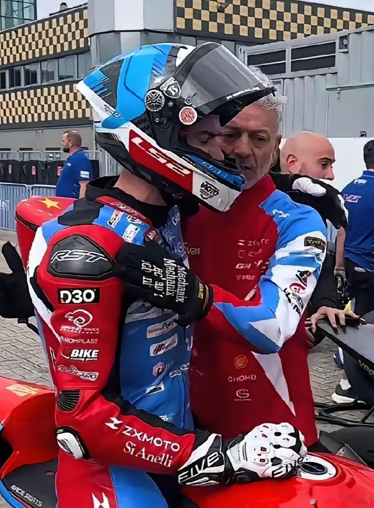 白发苍苍的是教练吧!赛后教练紧紧拥抱瓦伦丁!虽有遗憾,但是在一众车队车手围剿下,这场比赛是瓦伦丁个人能力与张雪机车赛车实力,又一次得到强力证明。上一站表现太出色了!,这站成了众矢之的!孤军奋战被对手团队作战包围了,最后违规那一下也是无可奈何,如果要走正常线路就会跟旁边的车撞上了。车队再聘请一位水平接近的车手,情况会好的多!