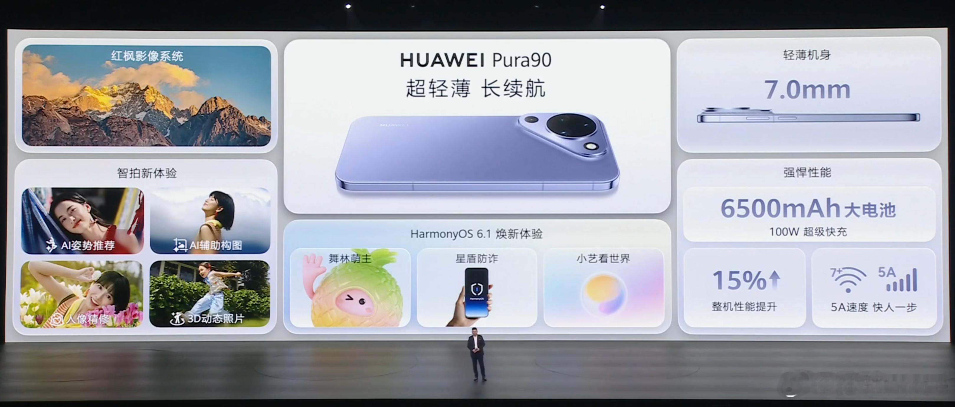 华为Pura 90,相比上一代整机性能提升15%,6.8英寸直屏,50MP 1/1.56 f/1.8 OIS+12.5MP超广+50MP f/2.2 3.7X OIS潜望长焦,全RYYB传感器,前后双红枫,100W+50W+6500mAh。华为Pura系列新品发布华为Pura90