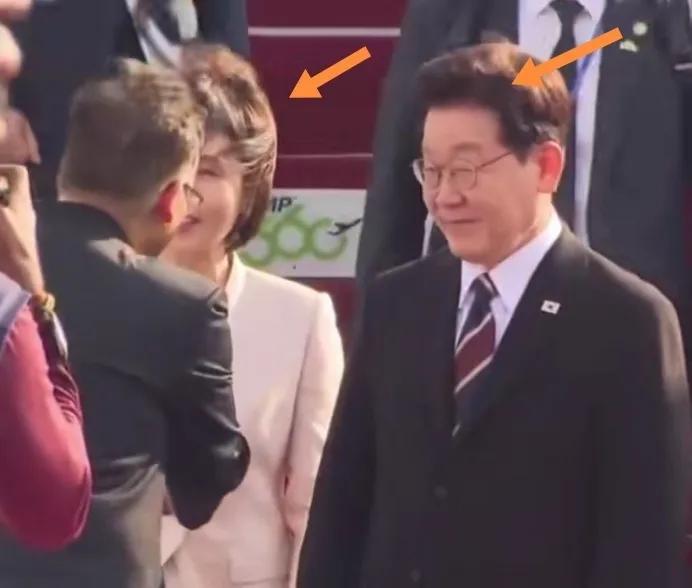 李在明携夫人访问印度走出飞机舱门起大风吹乱头发。