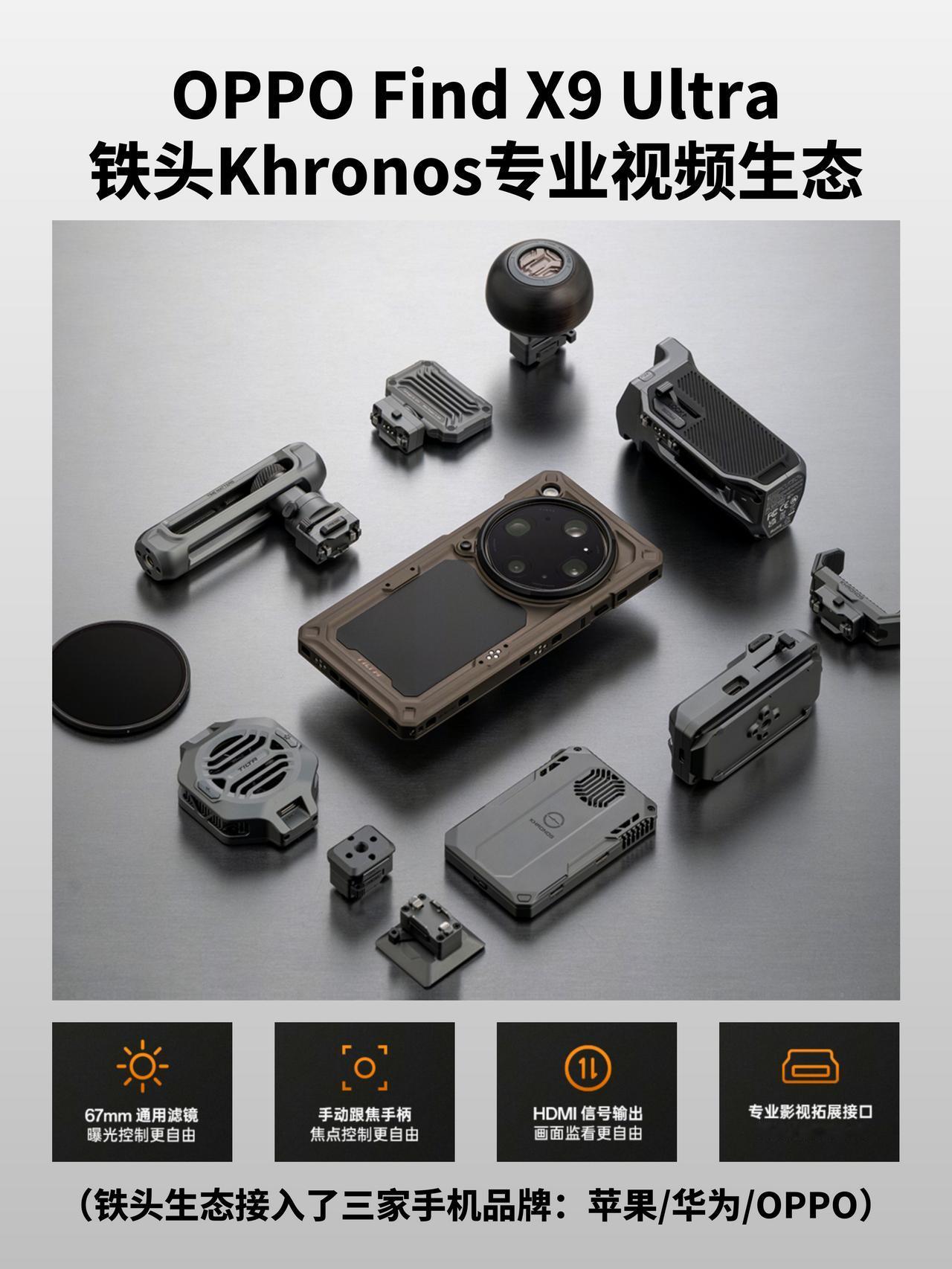 看官方刚公布的,OPPO Find X9 Ultra接入铁头Khronos专业视频生态,这个套装真有点帅吧?跟焦手柄、拓展接口、67mm通用滤镜、散热器等等,这一套下来真有点强啊😎