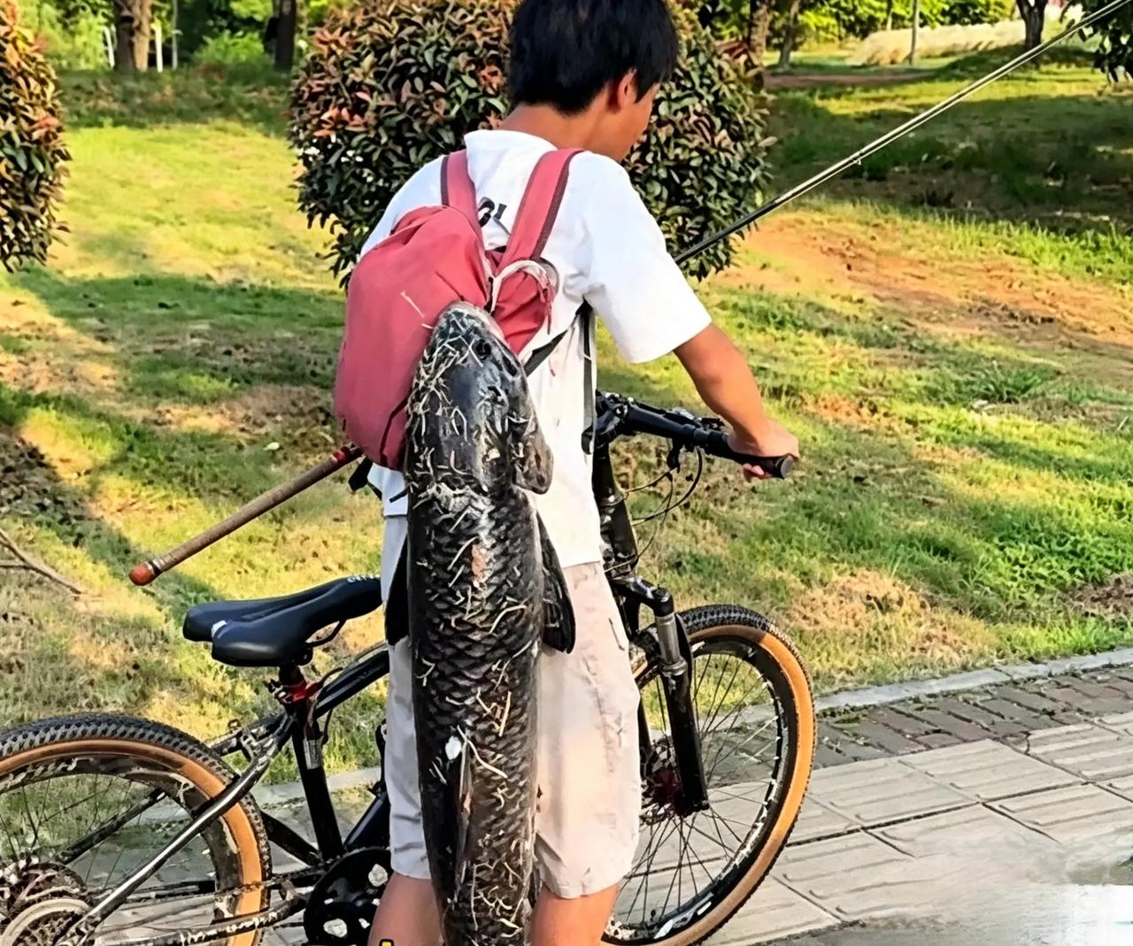 大人帮忙扶着鱼、减轻重量,他接受这份好意,但坚持自己骑车、自己把战利品带回家。他分得清什么是帮助,什么是依赖,小小年纪就有边界感,有主见,太难得。