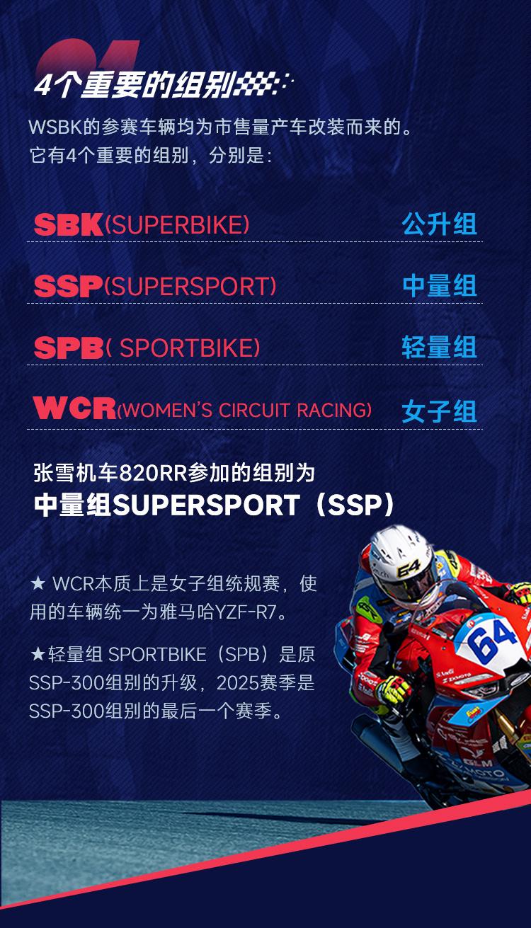 WSBK分为四个级别:公升级・顶级组、中量级・核心组、轻中量级・新生代组、女子组。张雪机车参加的是中量级・核心组。
