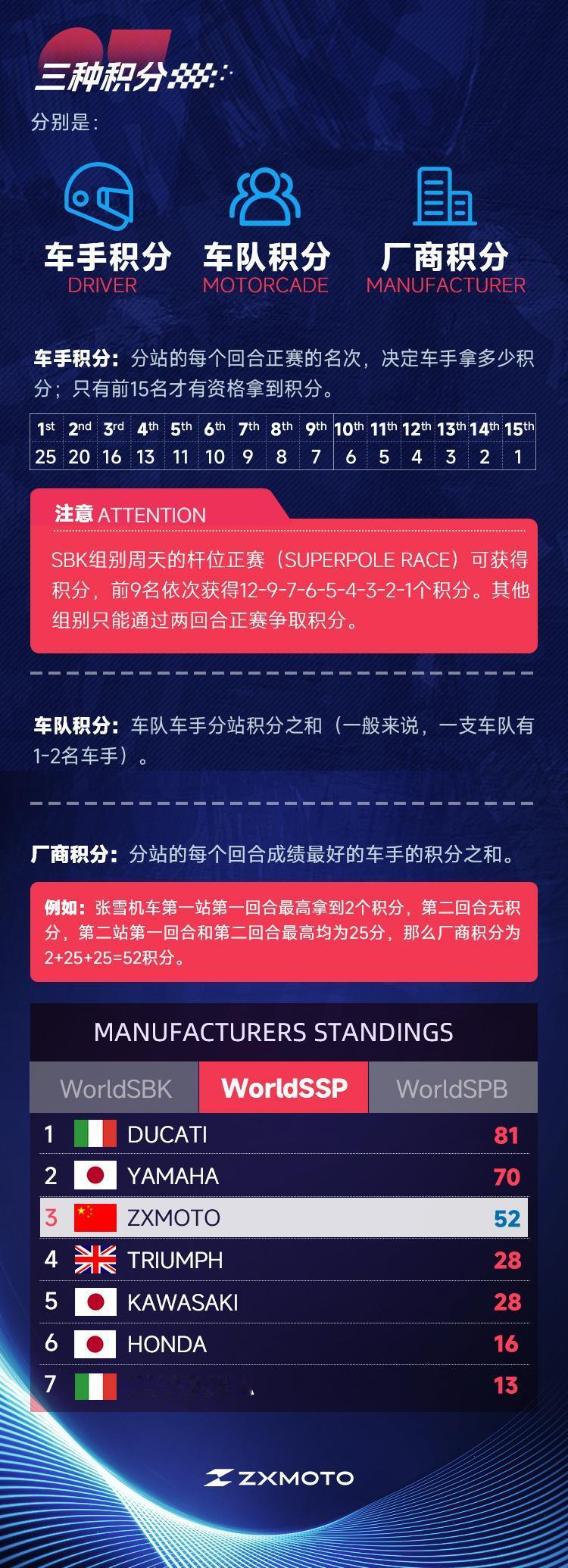 积分:车手积分、厂商积分、车队积分。目前张雪车手德比斯积分73,排第4名。张雪机车厂商积分74分,排第3名。