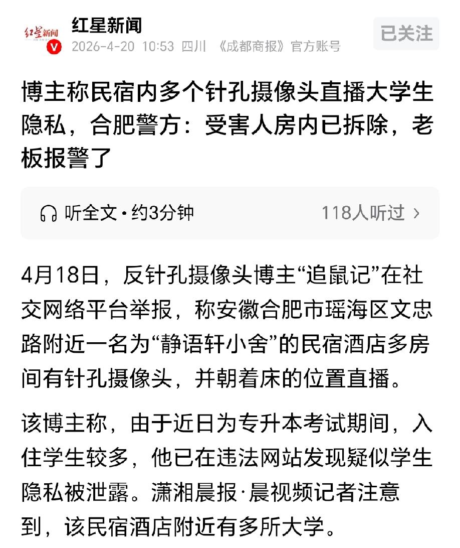 细思极恐!安徽合肥,专升本考试期间,很多学生入住民宿专心备考,不成想,有人竟然在酒店房间内安装了针孔摄像头,专门直播大学生们的隐私,有的甚至录屏上传非法网站。更可怕的是,民宿老板对此完全,不知情,摄像头安装了多久,没人知道,侵害了多少人的隐私,更是无从得知。