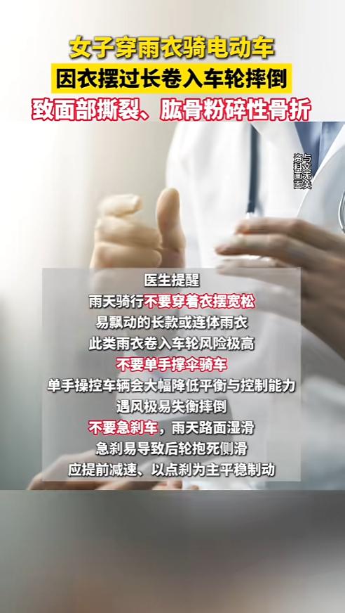 信息来源:《女子穿雨衣骑电动车,因衣摆过长卷入车轮摔倒,致面部撕裂、肱骨粉碎性骨折》广州日报