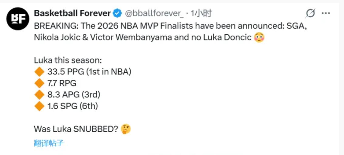 就在NBA官方公布MVP候选人分别是亚历山大,文班亚马和约基奇后,美媒纷纷为东契奇鸣不平,StatMuse晒出其核心数据并直言东子未入选候选非常不合理,BasketballForever也发文质疑“东契奇是不是被冷落了”。