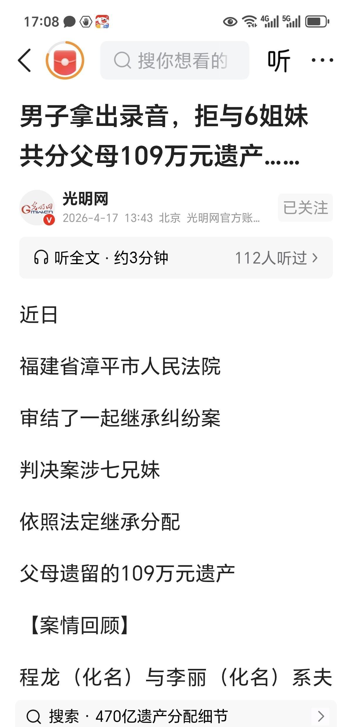哪曾想,仅仅两个月后,老程也一口气没上来,驾鹤西去。这下家里彻底炸了锅,父母双亡,巨款却全在小儿媳妇的卡里躺着。六个早就嫁做人妇的姐姐瞬间红了眼,齐刷刷堵上亲弟弟的家门,咬死这套房子是父母的共同财产,如今二老不在了,这109万必须七个人按人头平分!