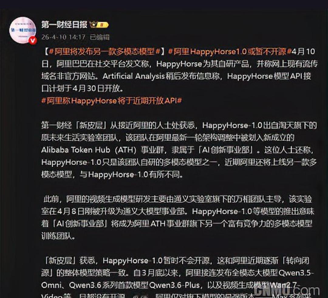 4月20日,阿里巴巴ATH宣布,其AI视频生成模型HappyHorse-1.0将于4月27日通过阿里云百炼平台逐步开放API测试,首批面向企业级客户。这匹“欢乐马”其实早已崭露头角:早在4月7日,它就以匿名方式在全球权威AI盲测平台ArtificialAnalysis的文生视频、图生视频双赛道登顶。随后在4月15日和17日,该模型又在LMArena平台的视频编辑榜单登顶,并在图生视频及文生视频榜单中跻身Top2,展现了其综合实力。据悉,HappyHorse项目由ATH创新事业部主导,联合了阿里平台技术、通义实验室及淘天技术等多个团队共同打造。在4月底完成开放测试后,HappyHorse-1.0计划于5月份正式发布商用。
