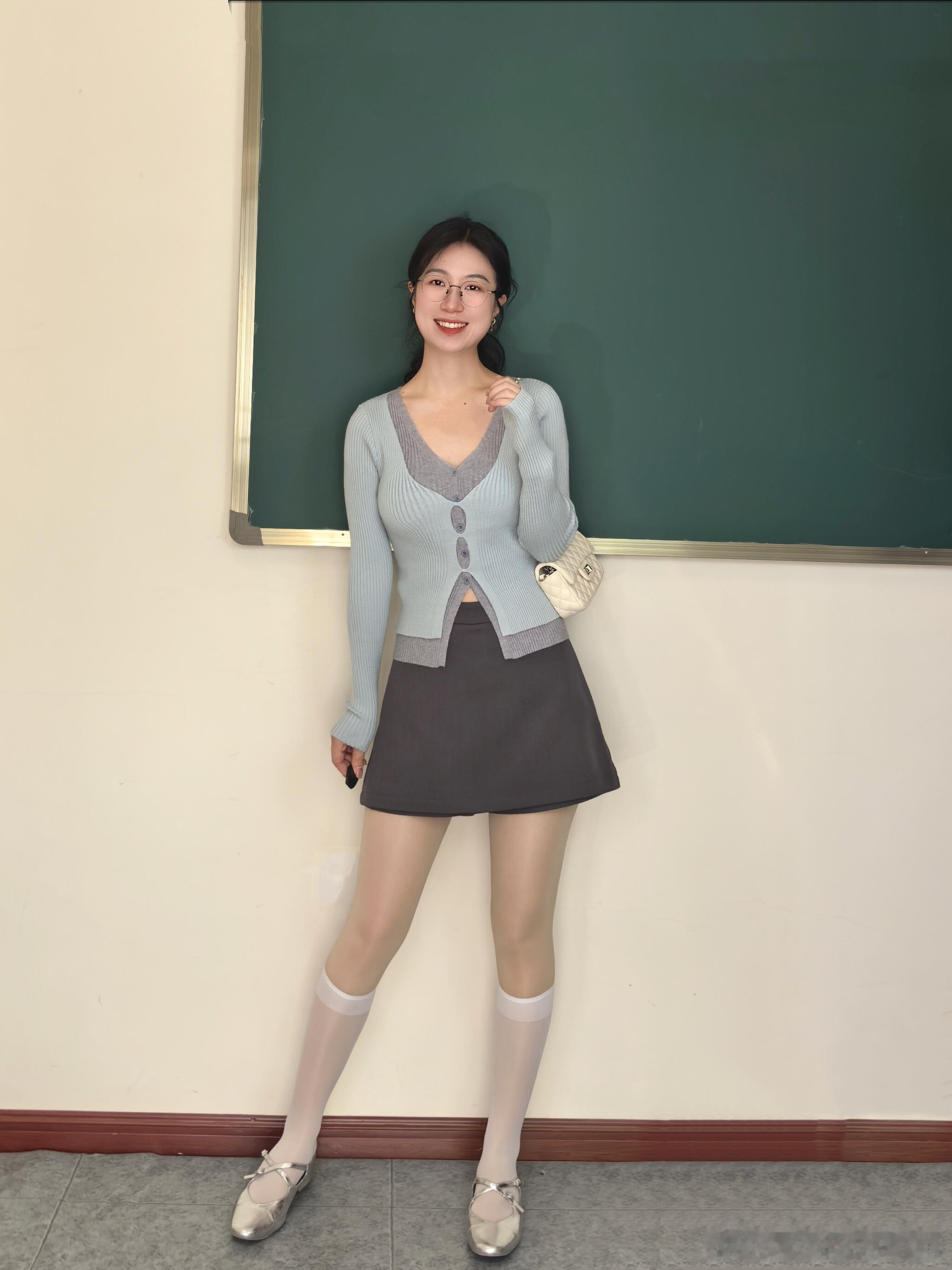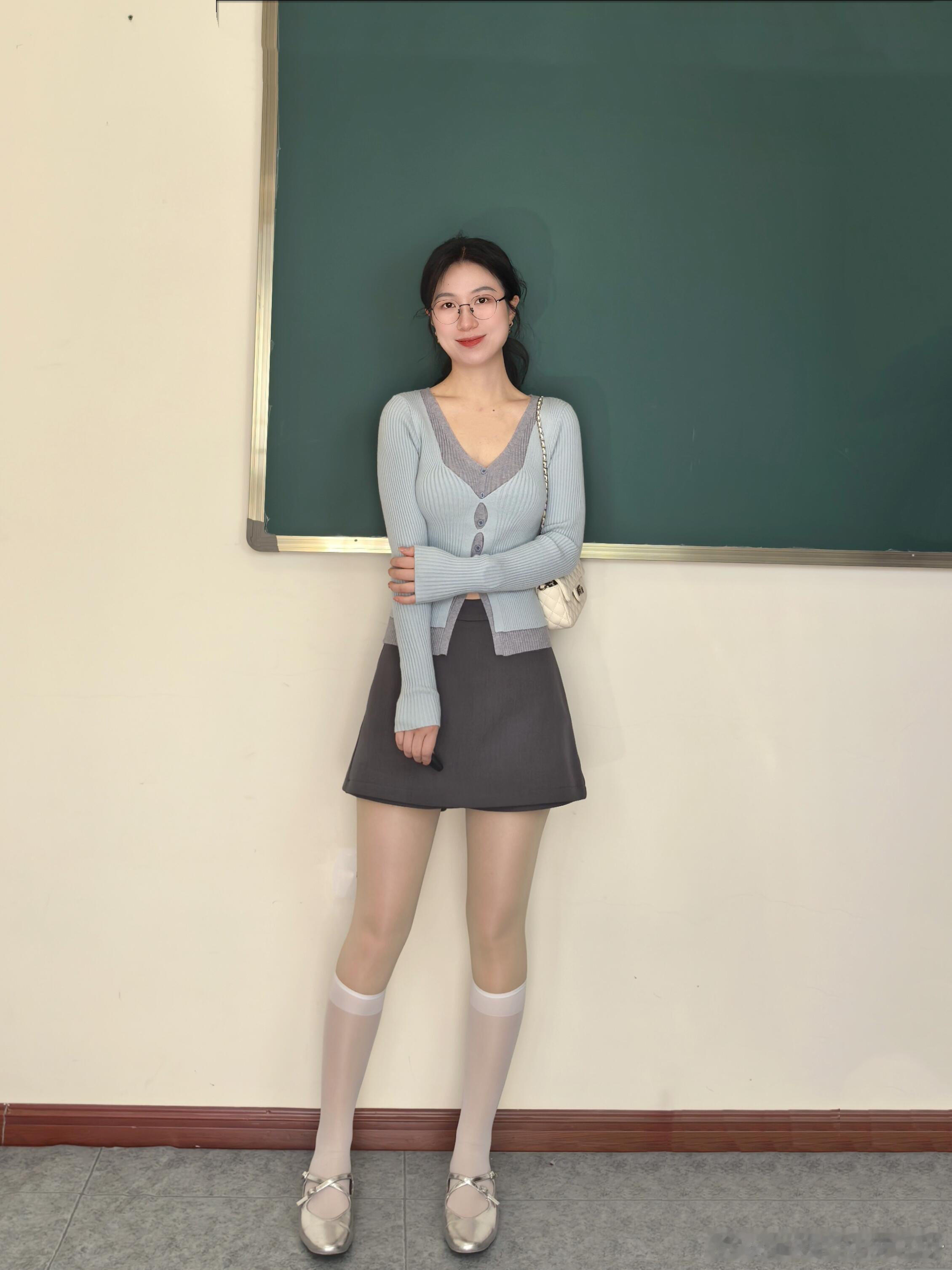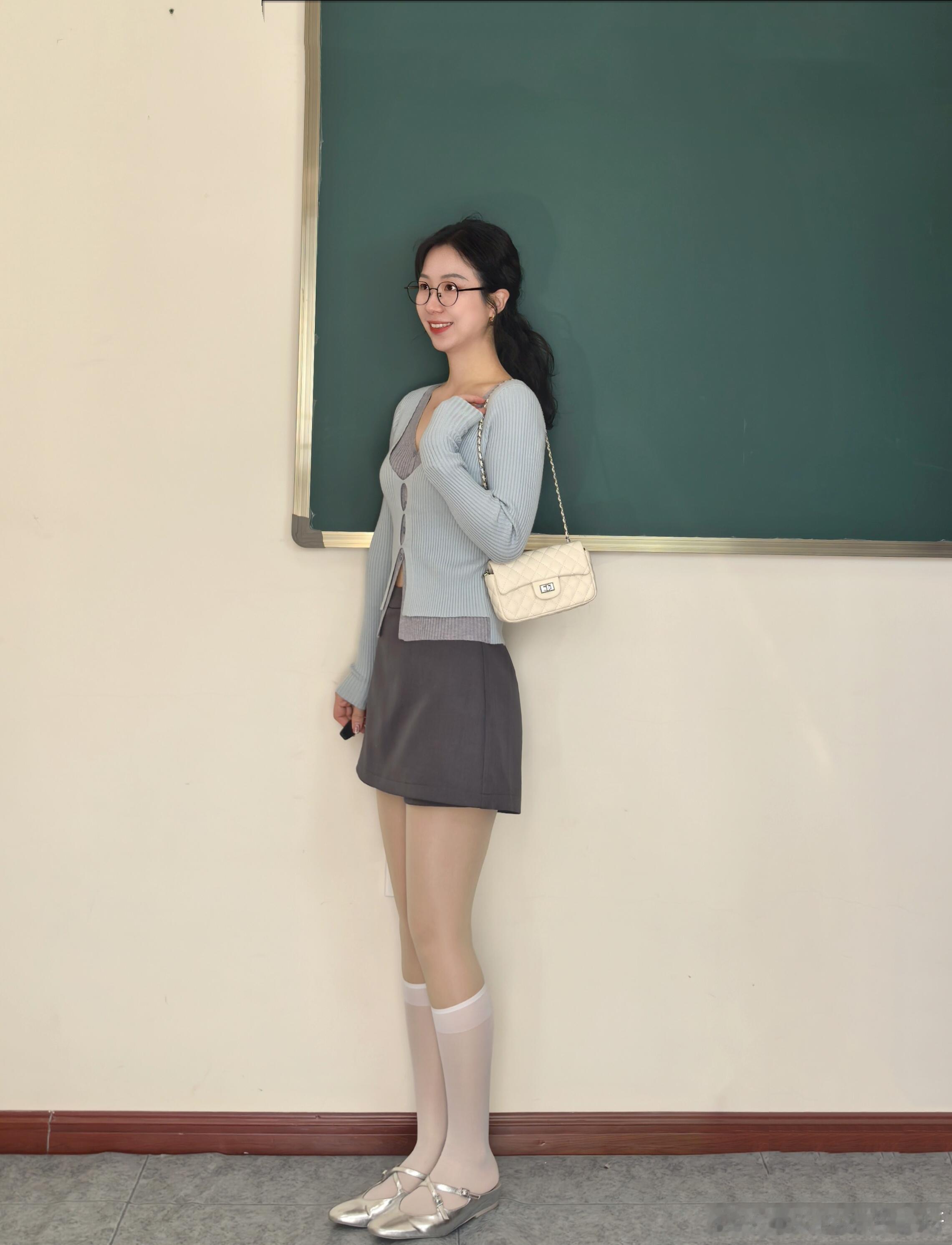 白丝小腿袜与银亮平底鞋真的太搭了~