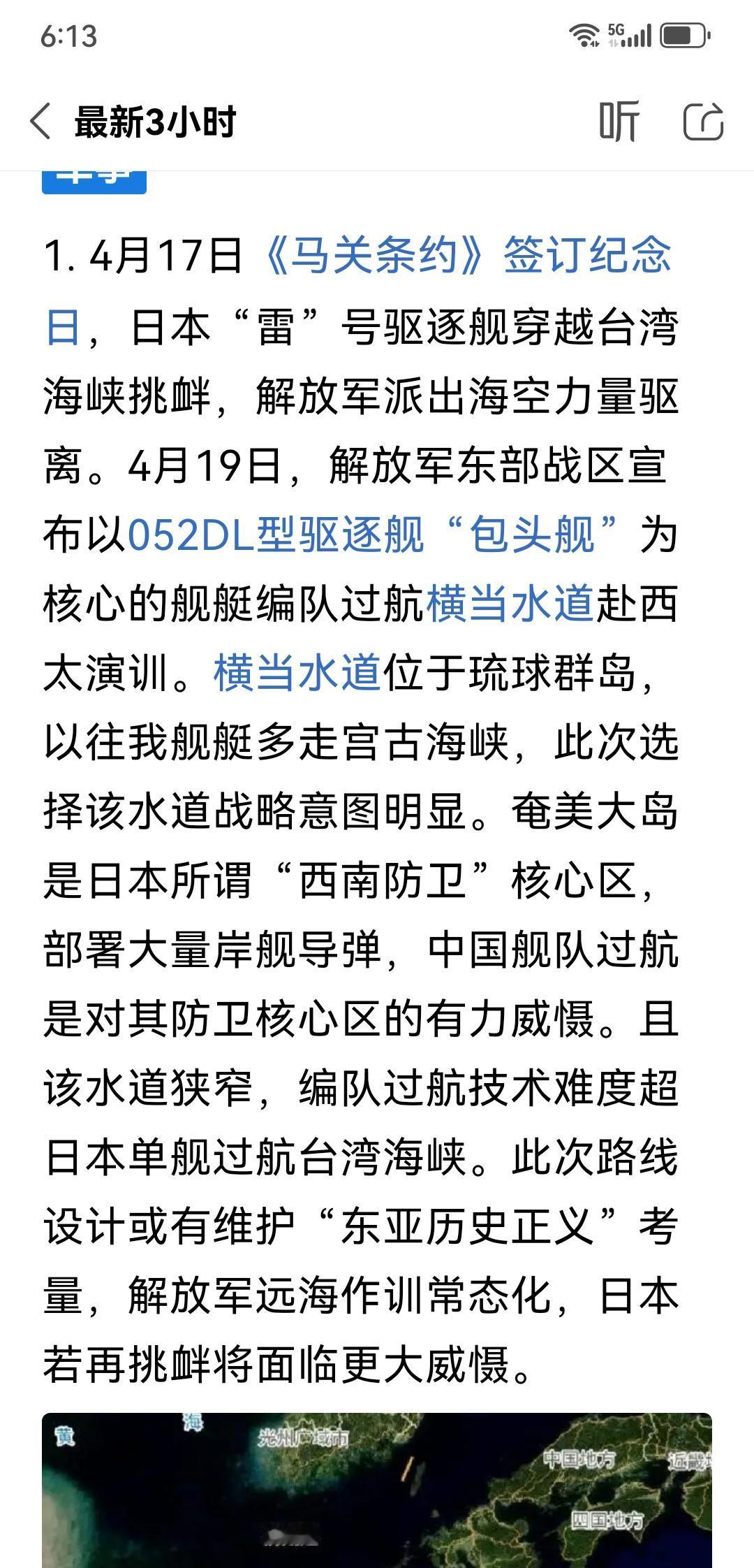 4月17日马关条约签定日,日本自卫队驱逐舰大张旗鼓的驶过台湾海峡,这是二战后日舰第一次单独过台湾海峡,并专门挑选在满清时代的中日甲午战争战败签定马关条约之日,这是有意对中国的挑衅,也是对中日关系陷入矛盾冲突时对中国的羞辱,表明日本坚持“台湾有事就是日本有事”的方针,根本就不怕中国近期的反击和制裁。