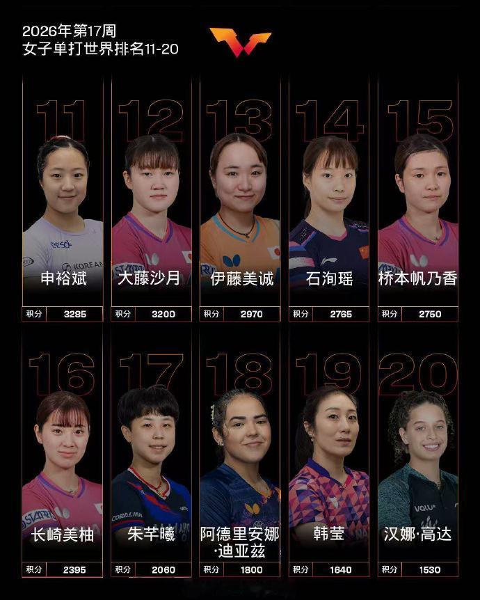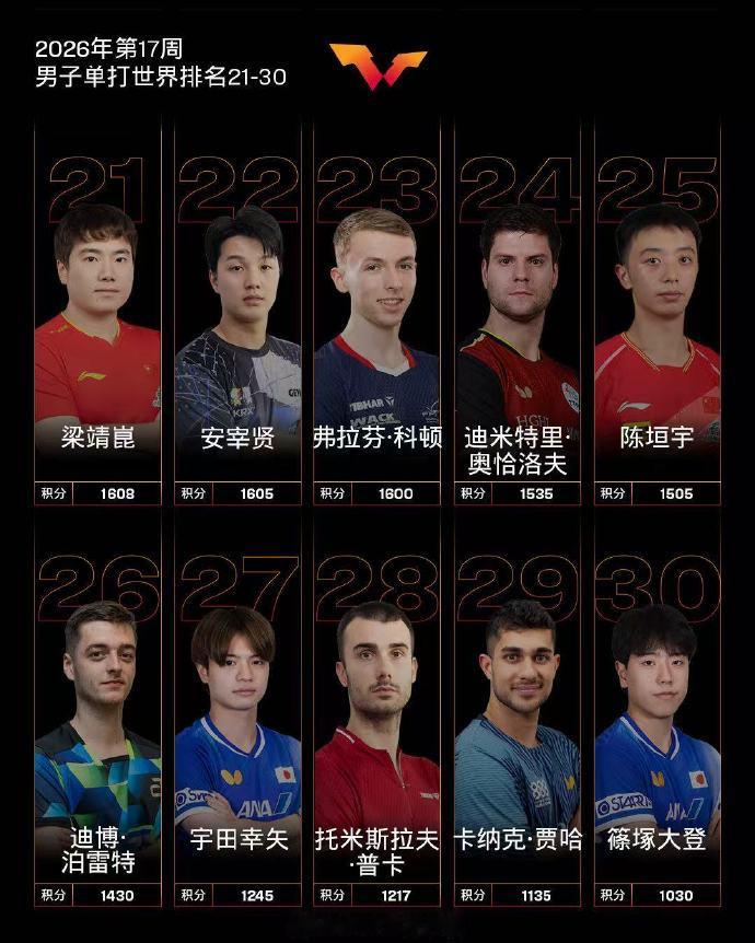 国际乒联2026年第17周世界排名 2026年第17周榜单更新!男单:王楚钦第一,林诗栋第六;张本智和升至第三,费利克斯·勒布伦第四。女单:孙颖莎、王曼昱、陈幸同包揽前三,朱雨玲第四,张本美和第五,陈熠创新高位列第六,蒯曼第七。