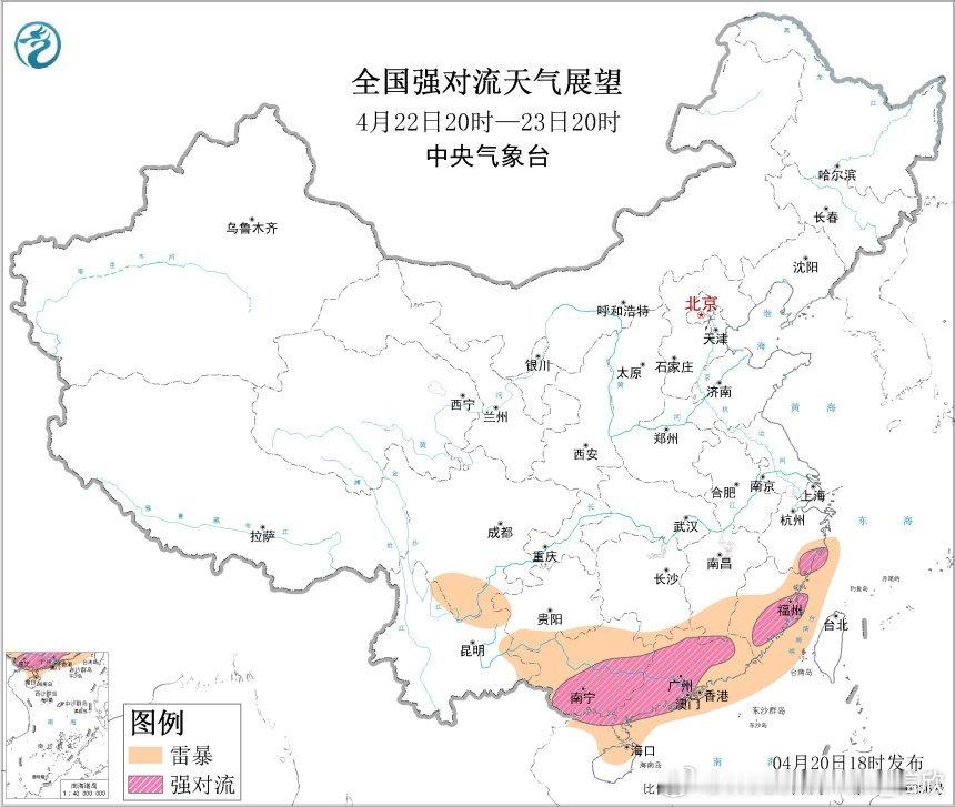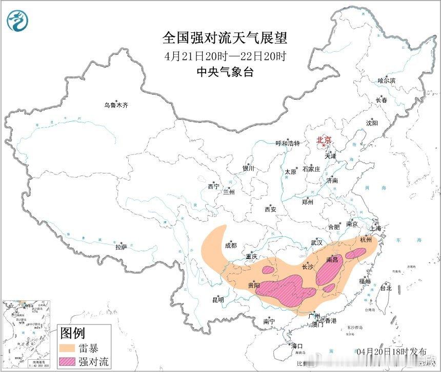 预计4月21日20时至22日20时,湖南南部、江西中南部、浙江中西部、贵州东南部、广西北部、广东西北部等地的部分地区将有强对流天气。预计4月22日20时至23日20时,江西南部、浙江南部、福建东南部、广西中东部、广东等地的部分地区将有强对流天气。