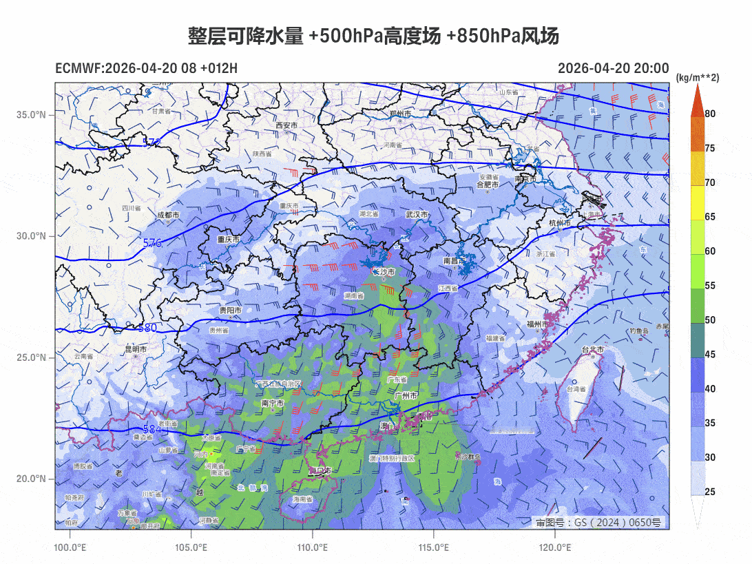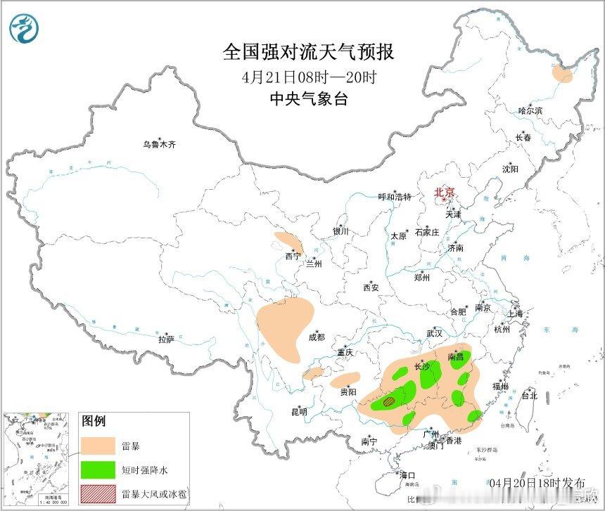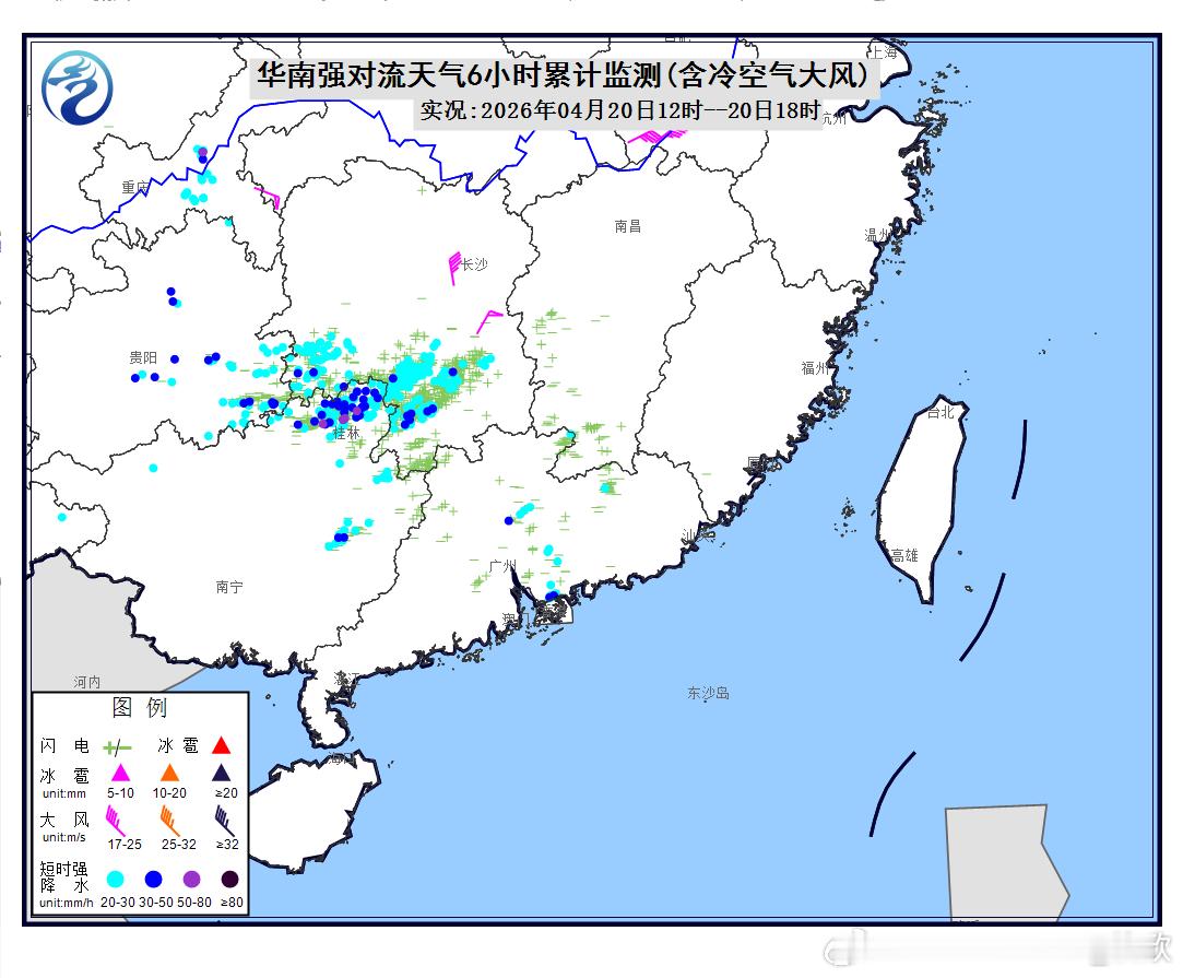预计4月20日20时至21日20时,湖南中南部、江西中南部、贵州西南部和中北部、广西中北部、广东东南部和北部等地的部分地区将有短时强降水天气,小时雨量20-40毫米,局地可达50毫米以上;另外,广西北部等地的局地将有雷暴大风或冰雹天气。