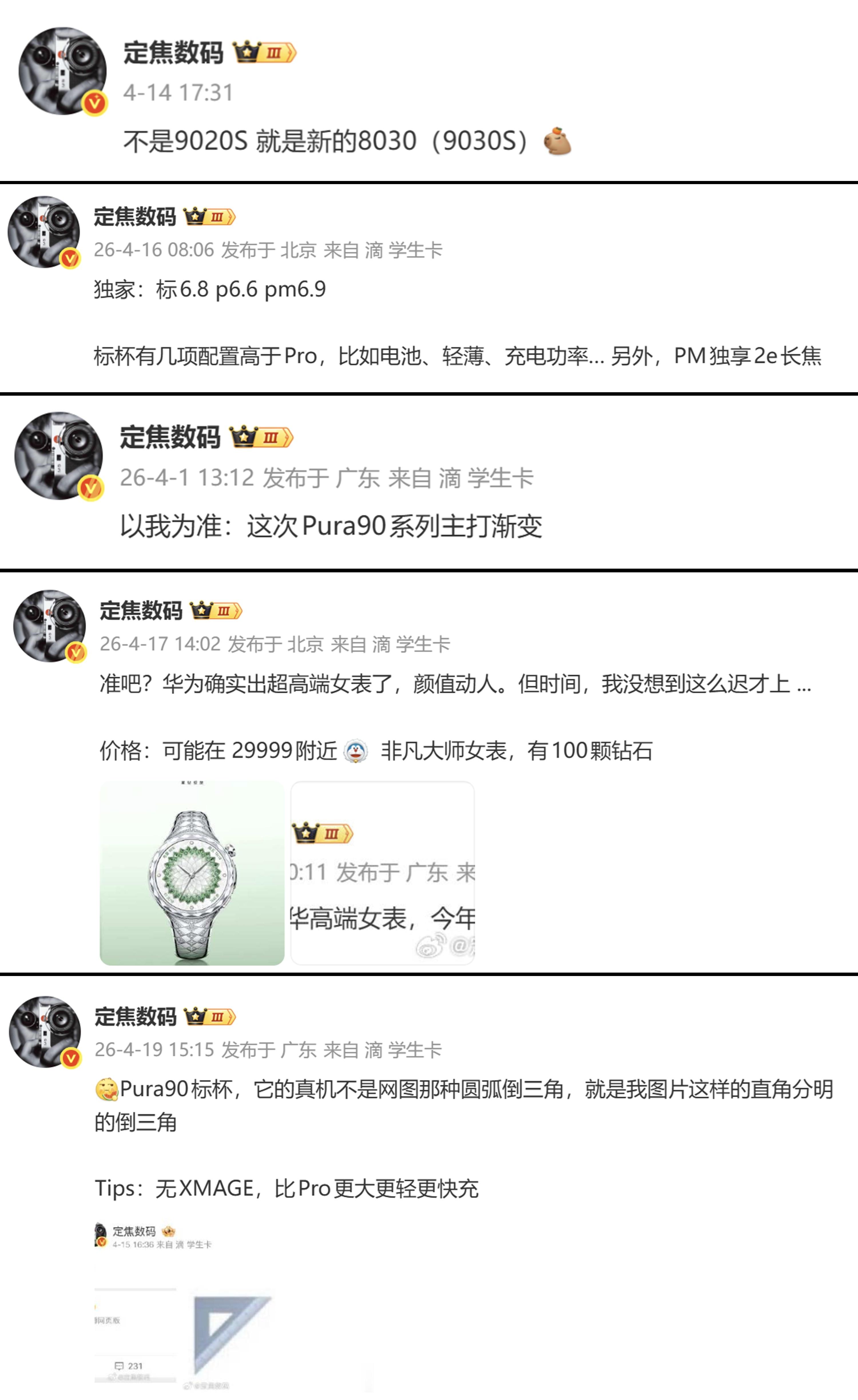 9030S ✔️、华为Pura90系列尺寸 ✔️、主打渐变 ✔️、Pura标杯更薄更大 ✔️、Buds2价格 ✔️、女表预告与定价 ✔️、标杯倒三角 ✔️、 X Max尺寸 ✔️、X Max影像 ✔️、新PC规格 ✔️、AI眼镜规格 ✔️、定价 M↑ 9↓ ✔️、微信不常驻秒收消息 ✔️