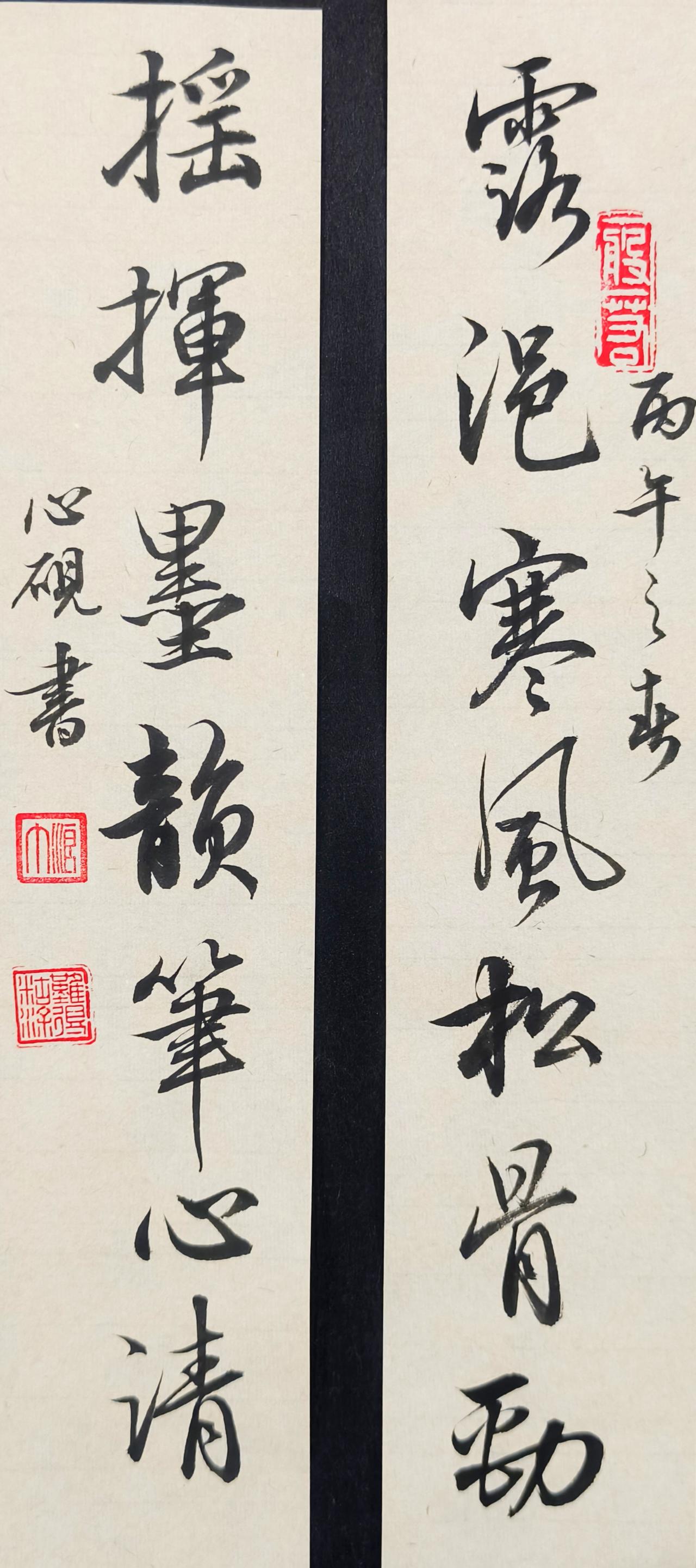 我细细品味这副对联的真意。这副对联借景抒怀,刚柔相济。上联写寒风冷露中苍松仍挺拔遒劲,以松喻人,赞颂不畏霜寒的坚贞风骨;下联写挥毫泼墨时,笔底流韵、心境澄明,展现文人以墨养心的清雅志趣,尽显刚正品格与脱俗情怀。