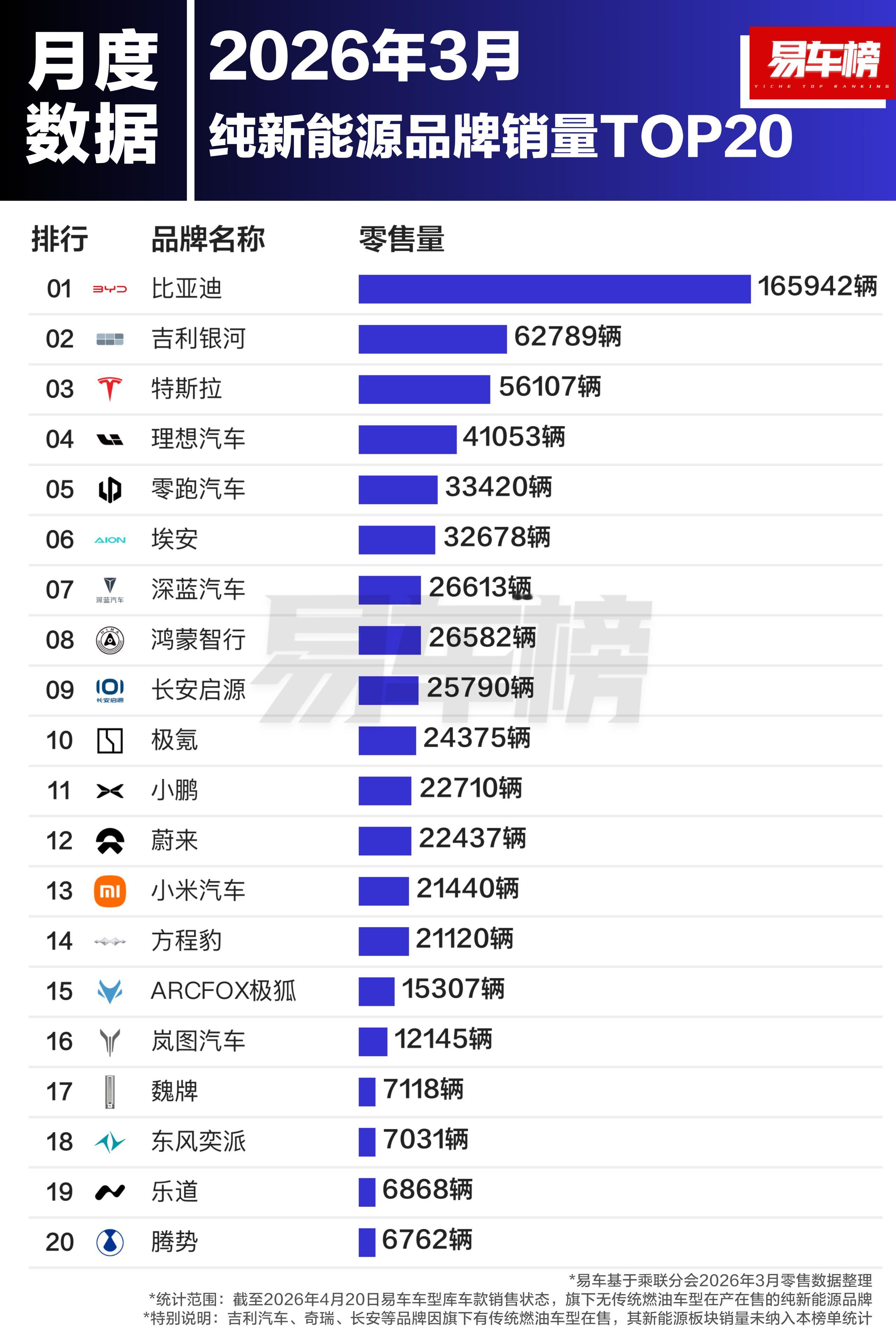2026年一季度及3月纯新能源品牌销量TOP20