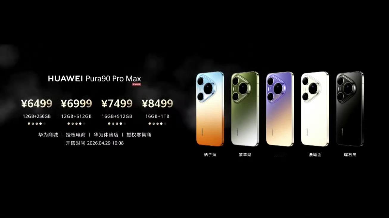 华为 Pura 90 Pro Max12GB+256GB 6499 元12GB+512GB 6999 元16GB+512GB 7499 元16GB+1TB 8499 元 华为发布会