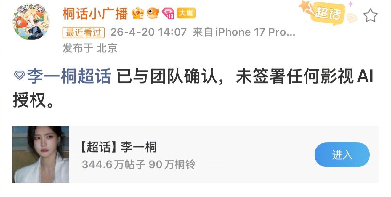 李一桐方否认签署影视AI授权李一桐未签署任何影视AI授权 李一桐方就AI授权传闻