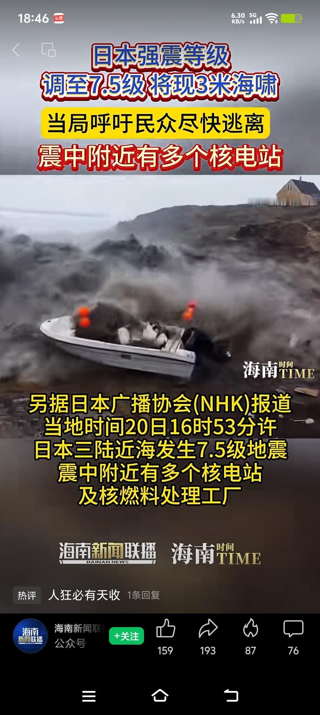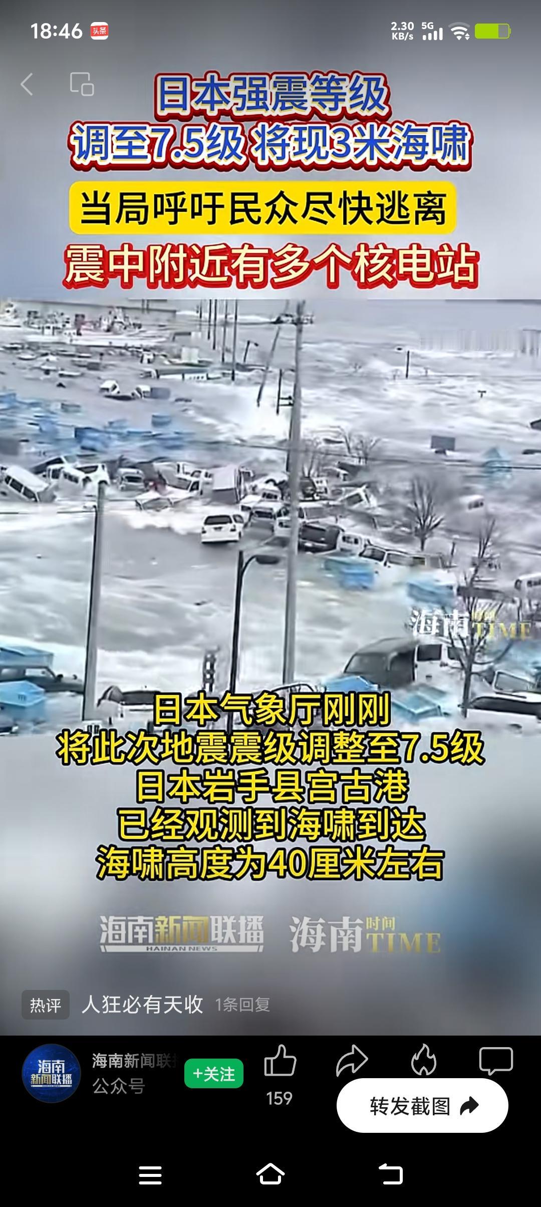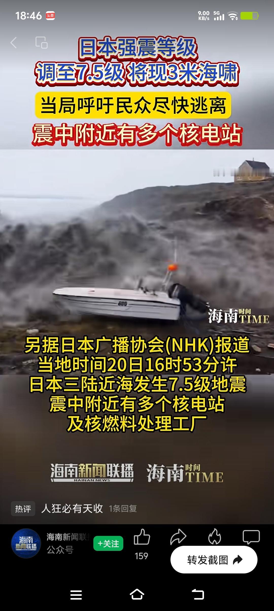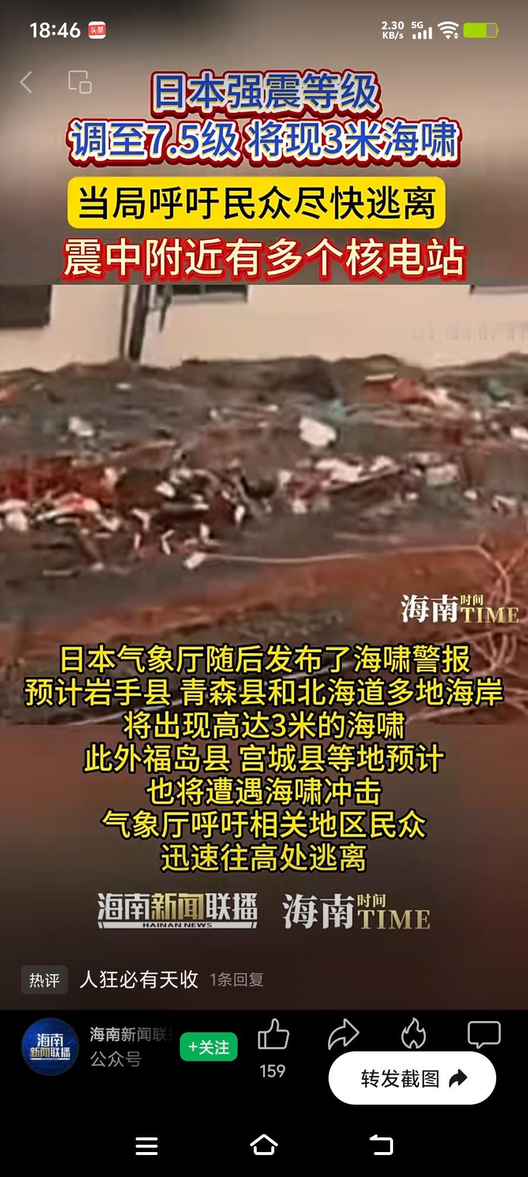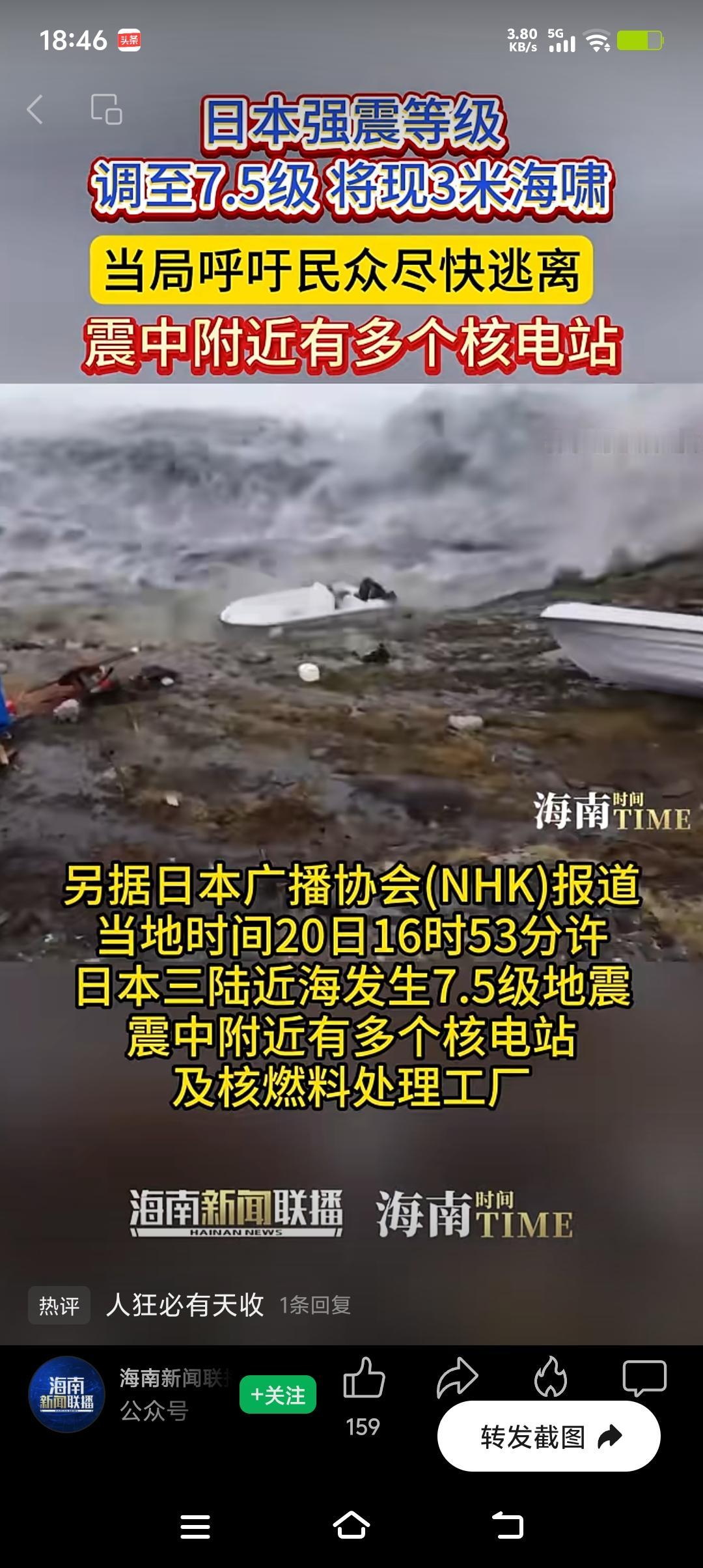 要知道,2011年福岛核事故就是地震引发海啸,重创核电站致核泄漏。这次强震还发布了海啸警报,万一核电站扛不住,后果不堪设想。希望核电站足够坚固,也期待日本做好安全防范,别再让核灾难重演。 声明:(借用网络视频)