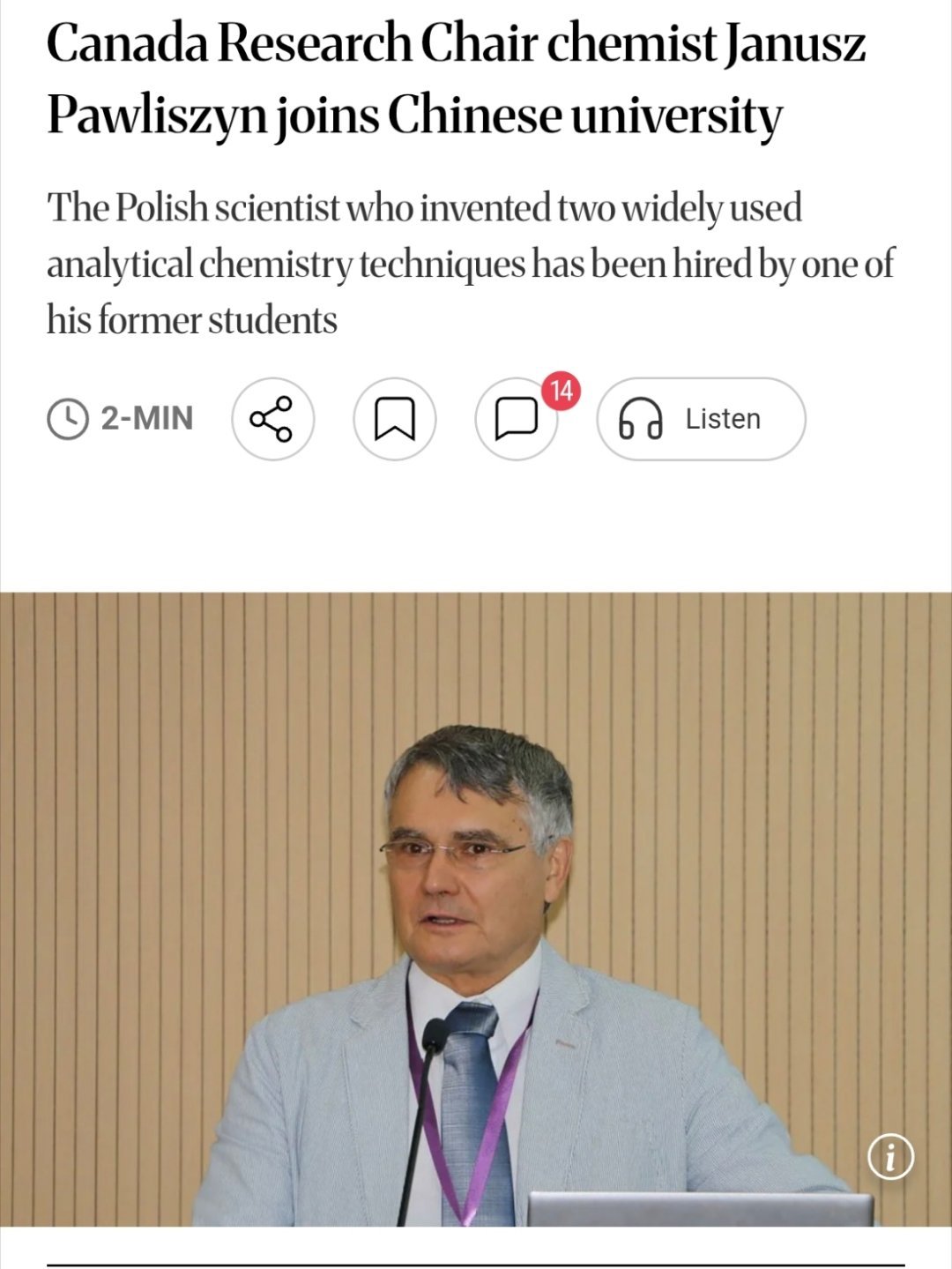 又又又一位外国科学家来华工作。¹ 这一次是雅努什·帕夫利申(Janusz Pawliszyn),全球知名的分析化学家,加拿大皇家科学院院士、加拿大工程院首席科学家。² 去了中山大学。³ 为啥是中山大学?因为中大化学学院院长欧阳钢锋,是帕夫利申的学生。准确说是2004-2005年合作的博士后。然后欧阳院长把昔时的老板“人才引进”来了。