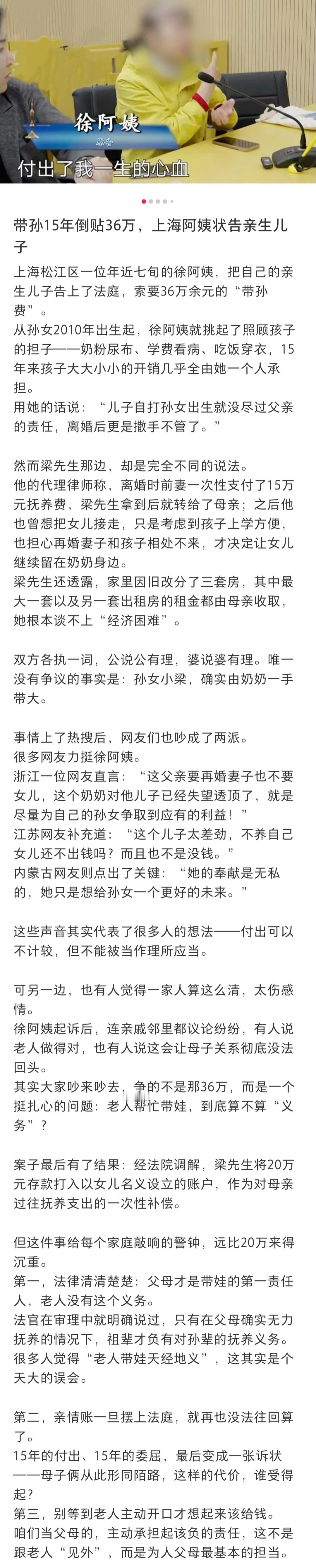 孩子妈妈给了15w抚养费,其他就是老人自己的房子收租。孩子也是老人带大的。这男的说来说去不就是,他一点责任没负吗,他有什么理啊