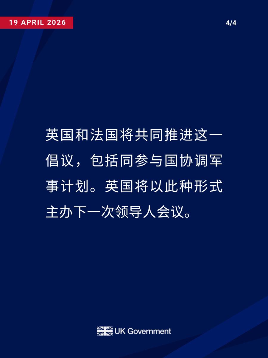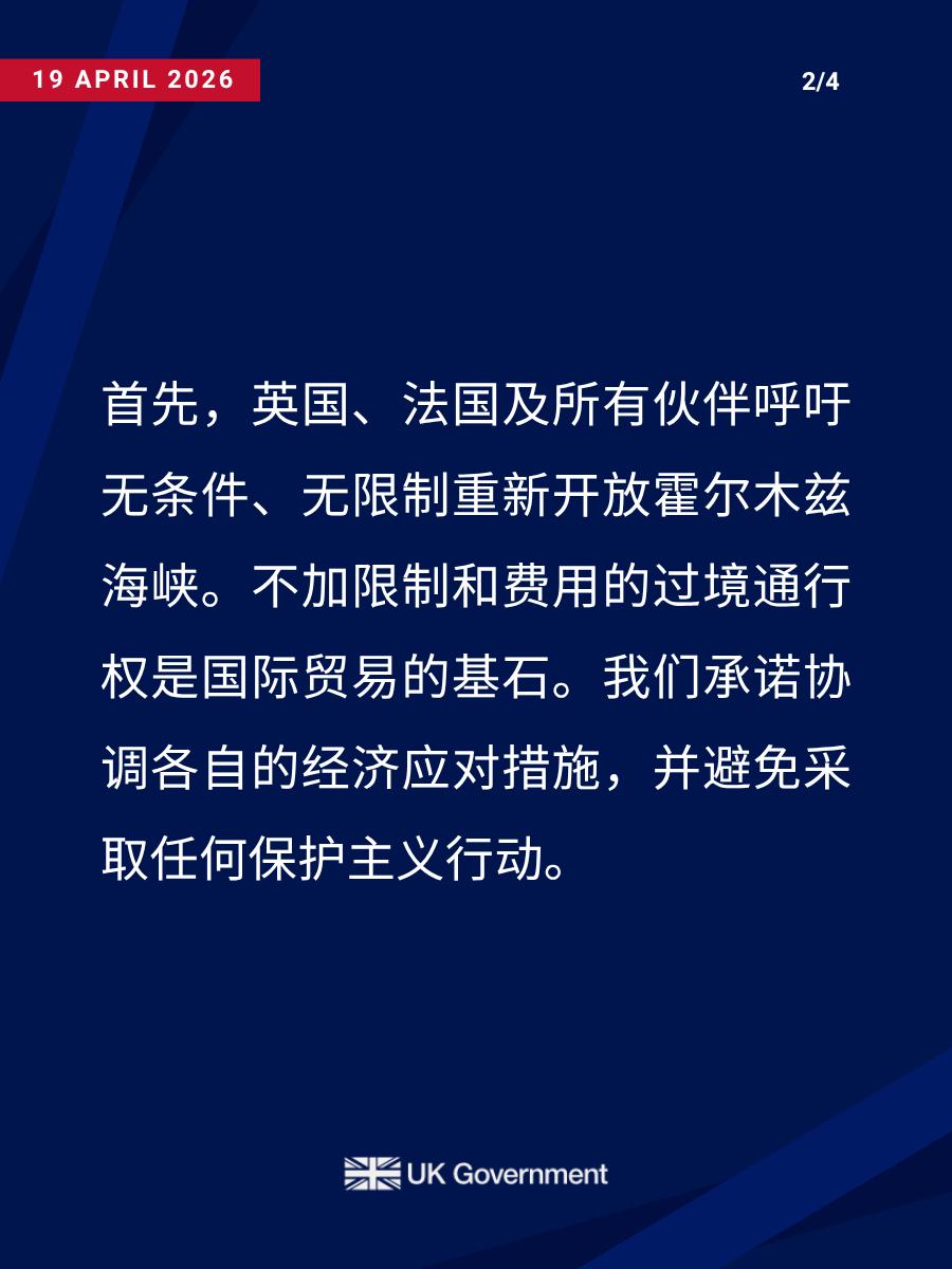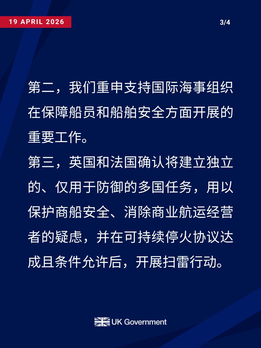 4月19日,英国和法国召集51个国家,就霍尔木兹海峡问题举行国际峰会。英国首相斯塔默和法国总统马克龙在霍尔木兹海峡国际峰会后发表联合声明。