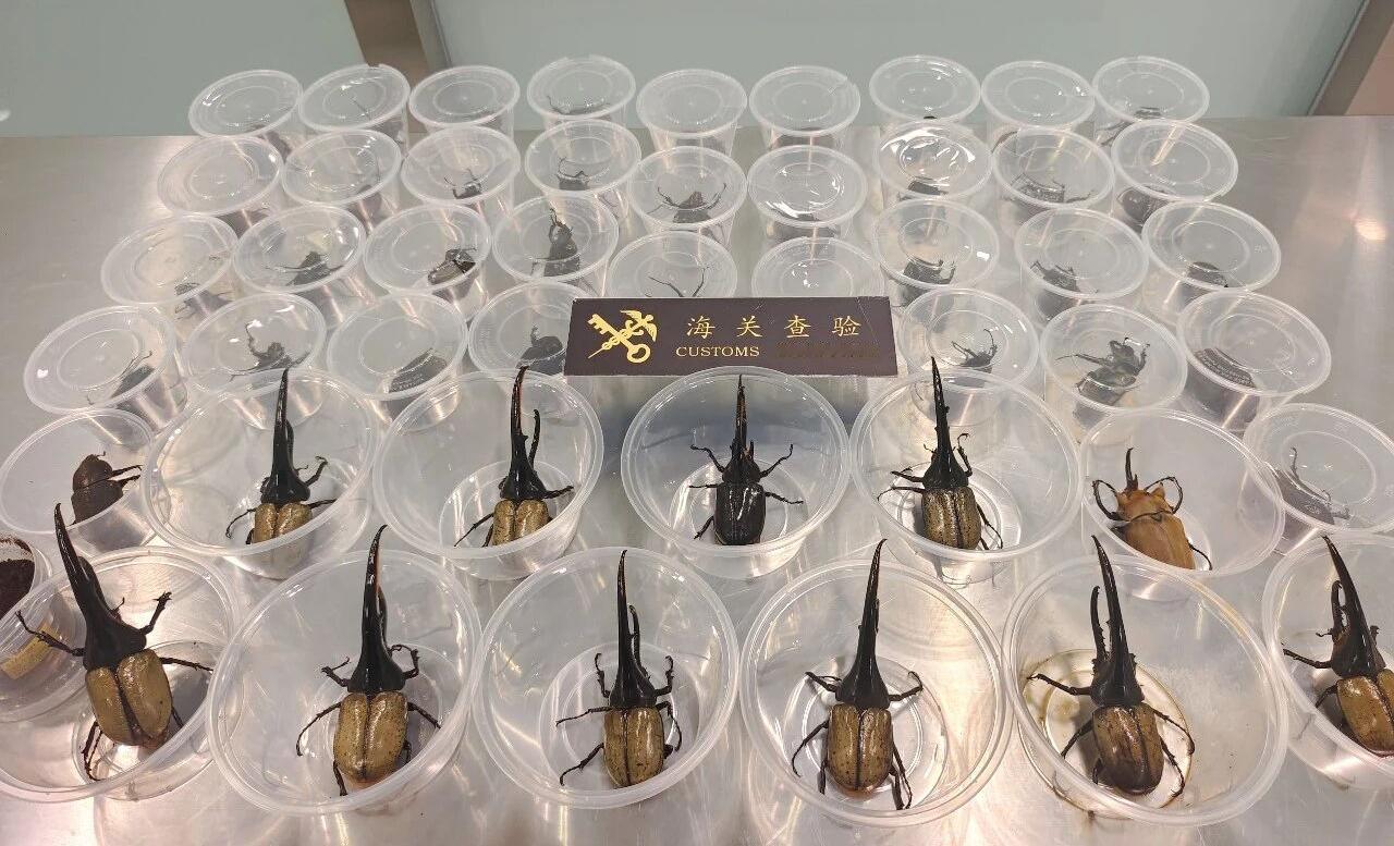 青岛机场,一名进境女子推着行李箱从绿色通道经过,关员发现,她行李箱里的衣物,堆叠不规则块状黑影,开箱查获49只活虫子。