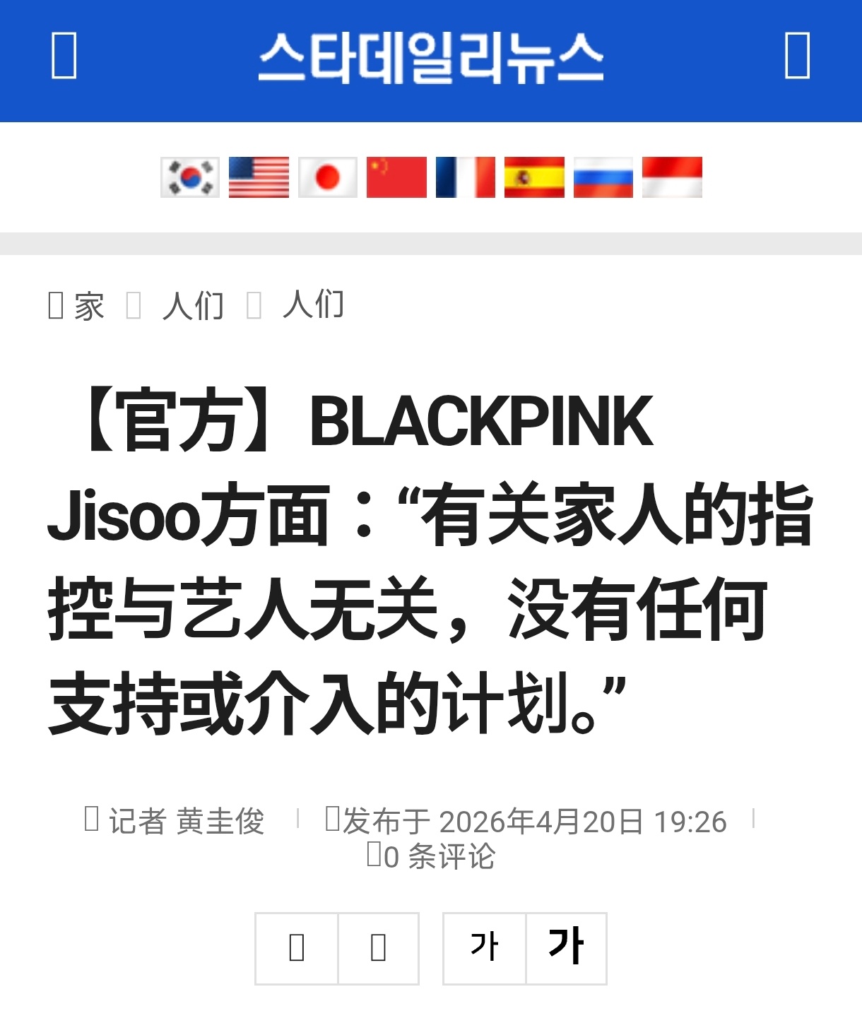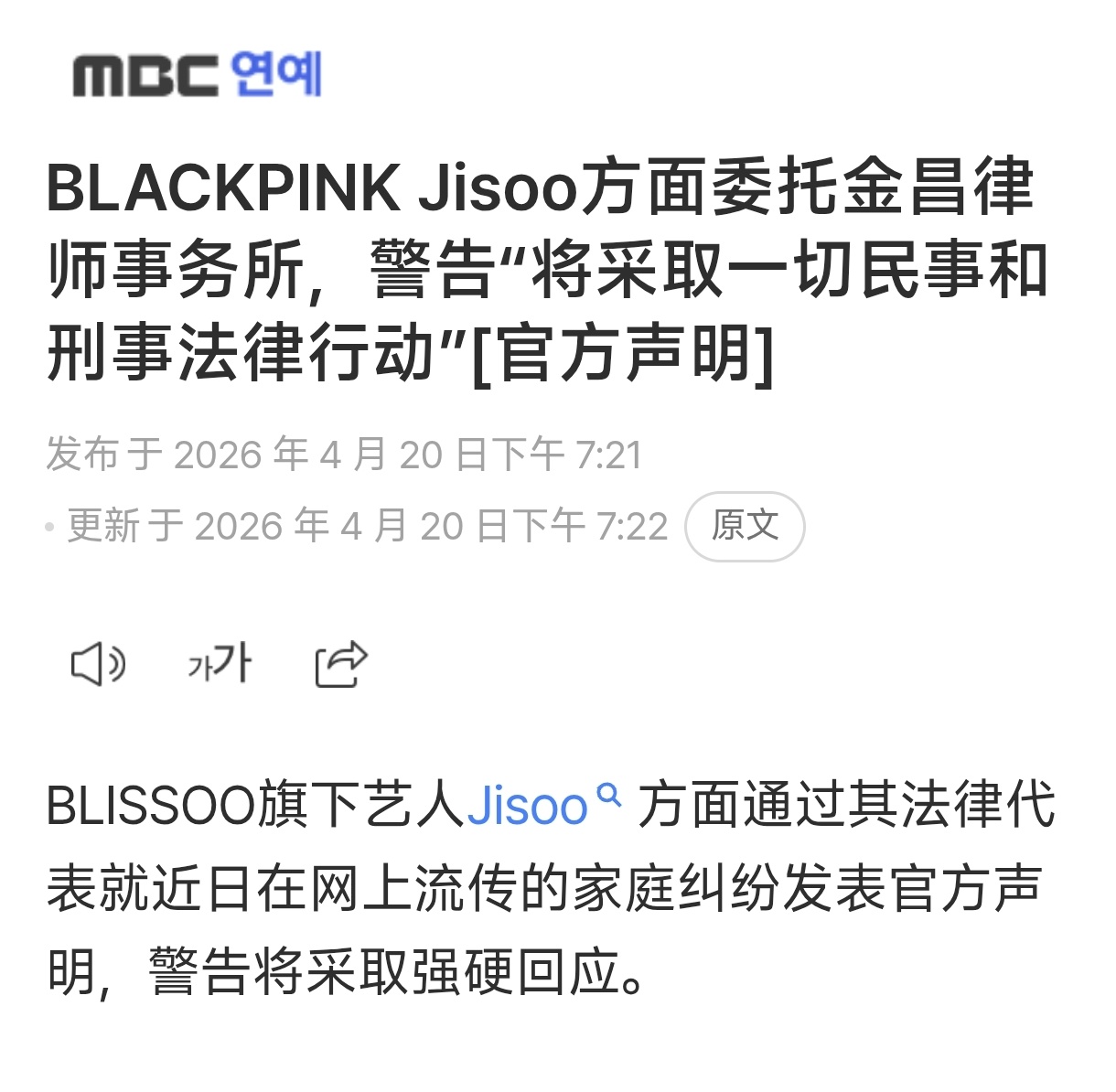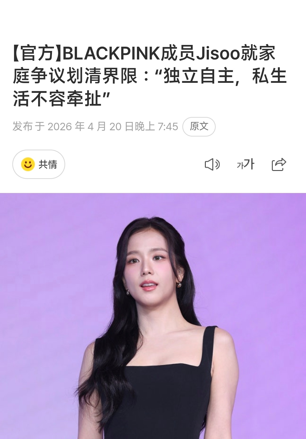 “BLACKPINK成员Jisoo所属经纪公司Blissoo的法律代表、金昌律师事务所的律师殷贤浩就近日在网络和社交媒体上流传的有关该艺人家庭的事件发表了官方声明。
