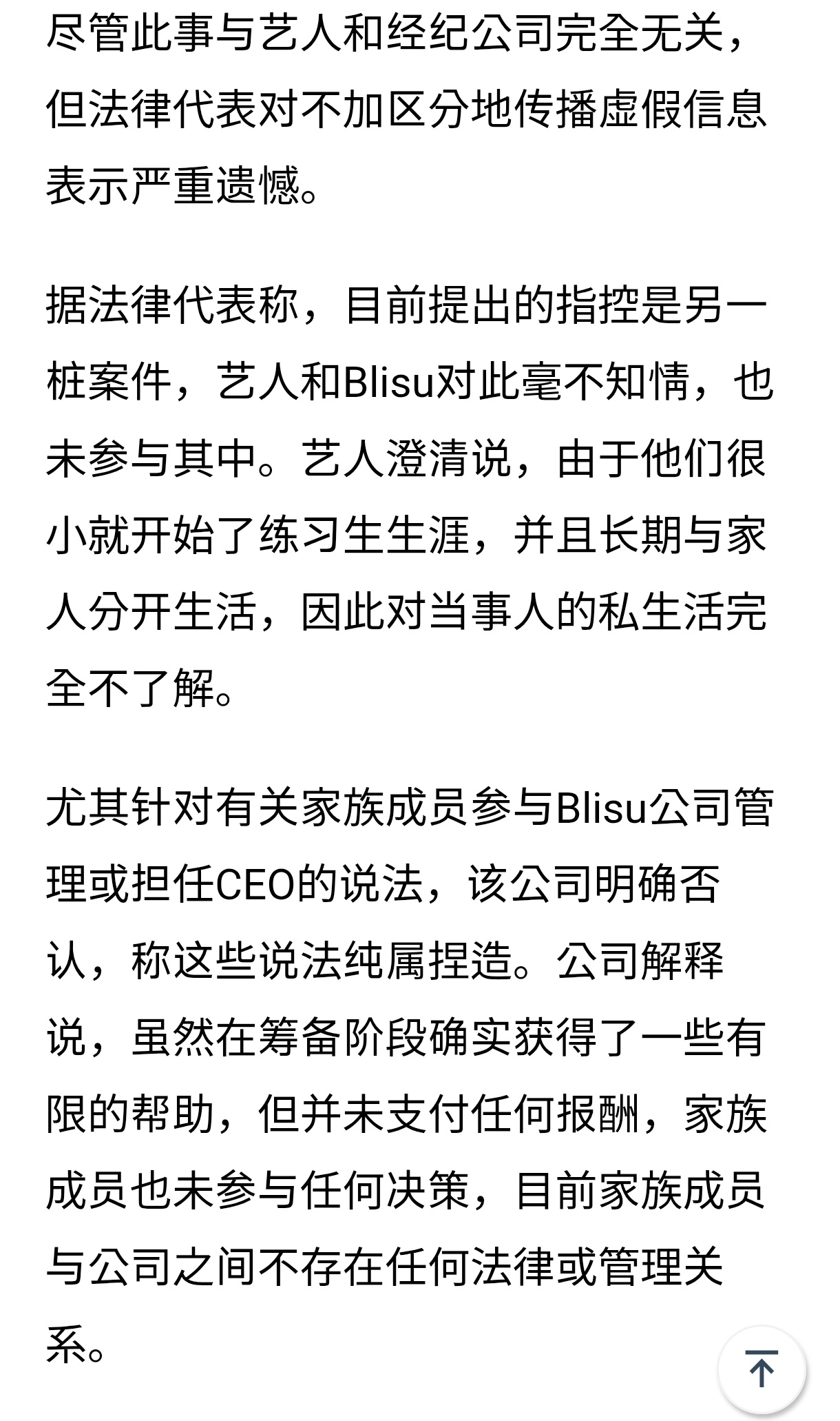 艺人澄清说,由于他们很小就开始了练习生生涯,并且长期与家人分开生活,因此对当事人的私生活完全不了解。