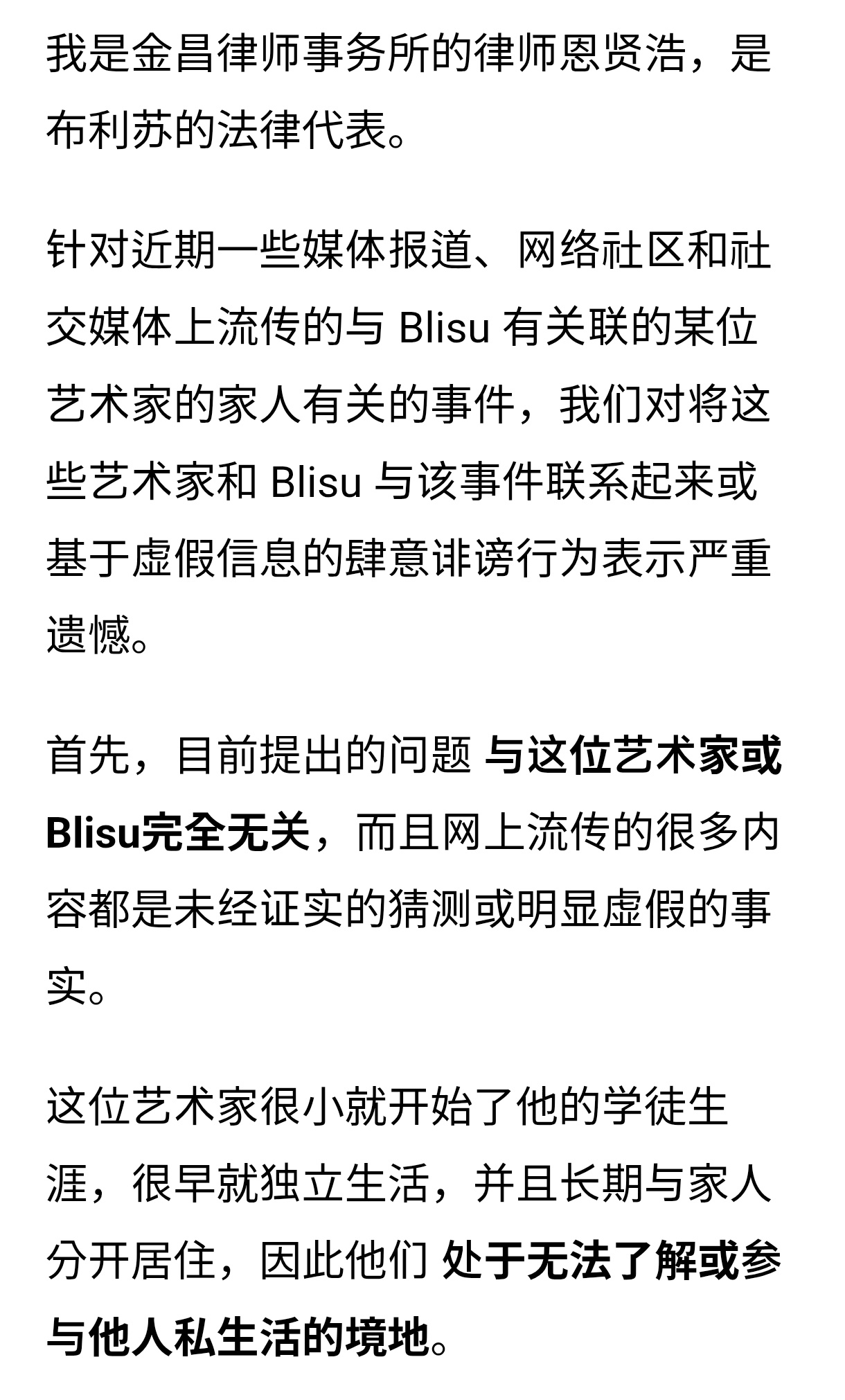 针对近期一些媒体报道、网络社区和社交媒体上流传的与 BLISSOO有关联的某位艺术家的家人有关的事件,我们对将这些艺术家和 BLISSOO与该事件联系起来或基于虚假信息的肆意诽谤行为表示严重谴责。