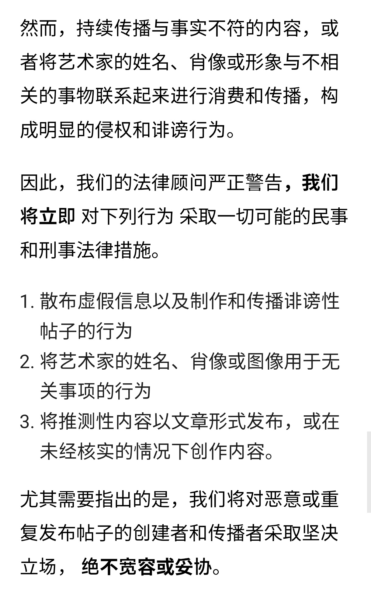 然而,持续传播与事实不符的内容,或者将艺术家的姓名、肖像或形象与不相关的事物联系起来进行消费和传播,构成明显的侵权和诽谤行为。