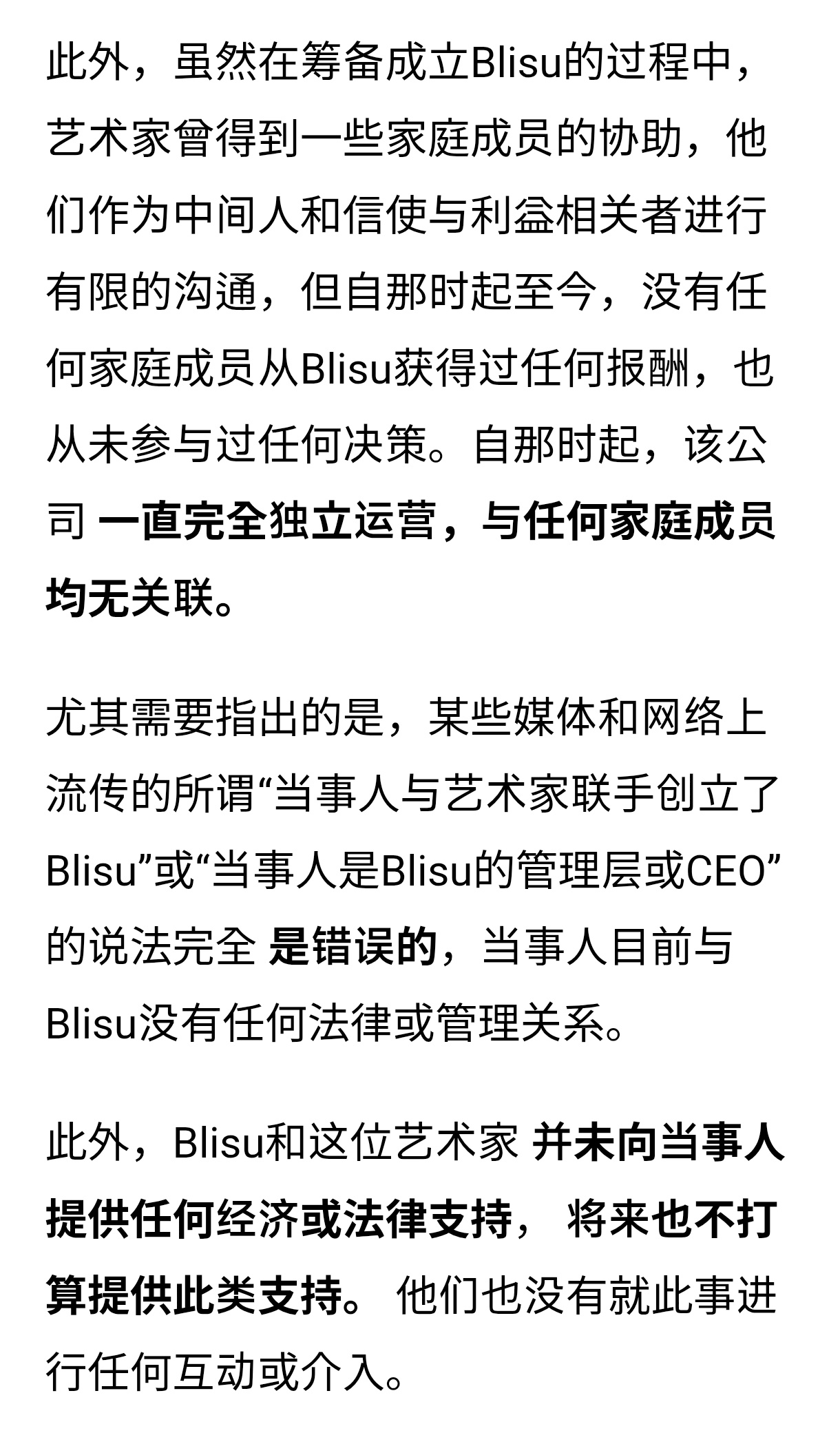 尤其需要指出的是,某些媒体和网络上流传的所谓“当事人与艺术家联手创立了BLISSOO”或“当事人是BLISSOO的管理层或CEO”的说法完全是错误的,当事人目前与BLISSOO没有任何法律或管理关系。