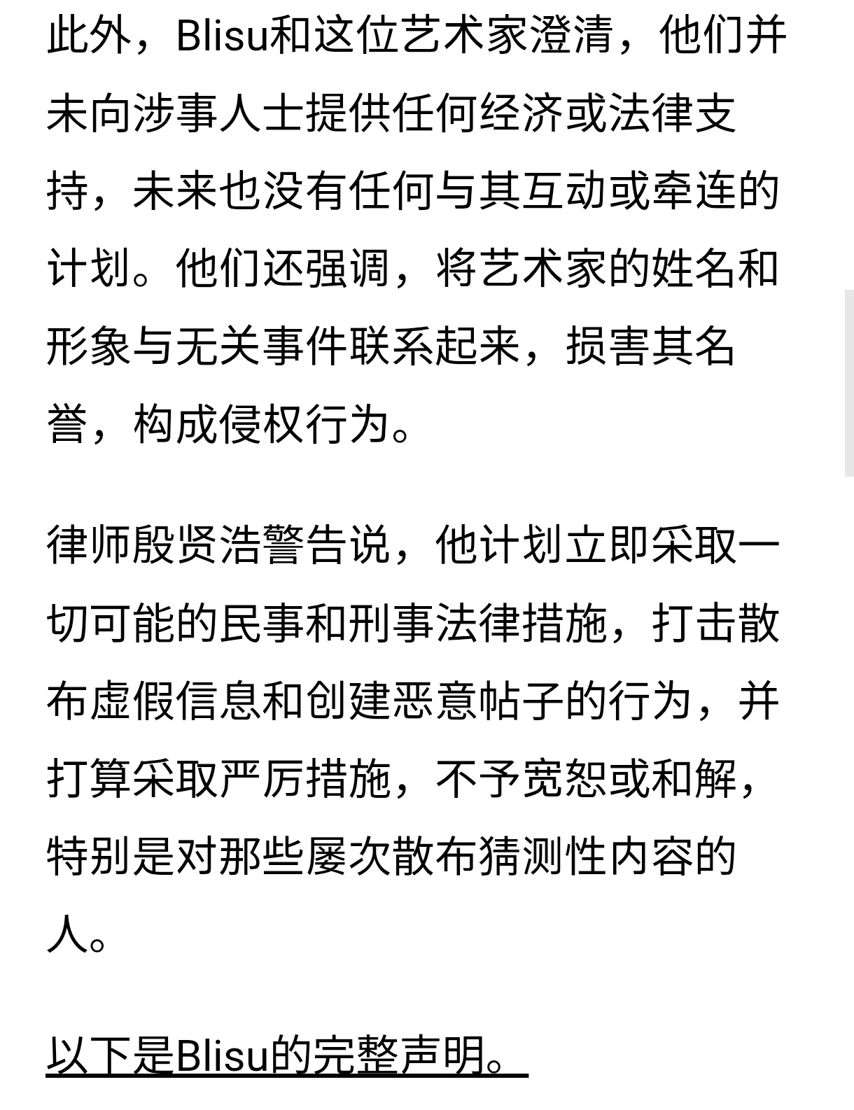 此外,BLISSOO和这位艺术家澄清,他们并未向涉事人士提供任何经济或法律支持,未来也没有任何与其互动或牵连的计划。他们还强调,将艺术家的姓名和形象与无关事件联系起来,损害其名誉,构成侵权行为。