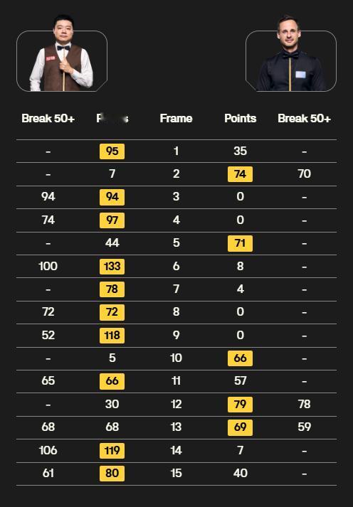 丁俊晖第一阶段的表现相当优异,手感火热,长台的准度极高,比赛过程打得行云流水,防守解球同样格外严密,凭借高水准的发挥是取得7-2领先,其中一杆破百和四杆50+,距离晋级仅一步之遥。