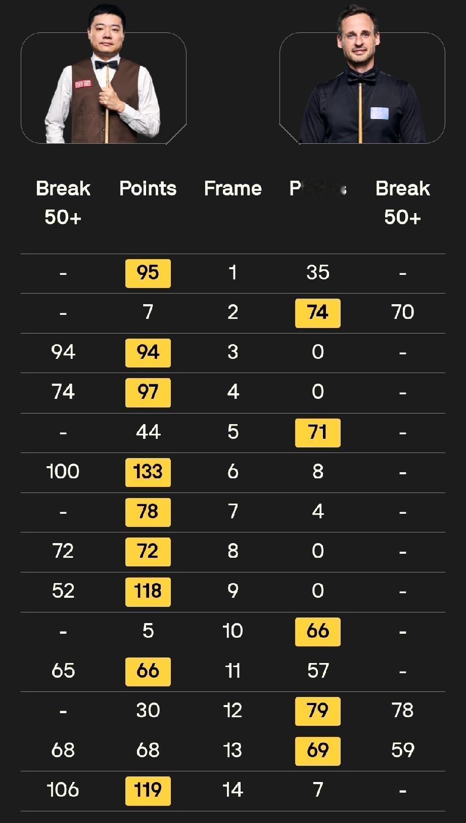第14局,丁俊晖先上手13分转入防守,土豆哥拼长台不进,留下机会。丁俊晖再度上手清台,单杆106分,119:0拿到5个赛点,9:5。
