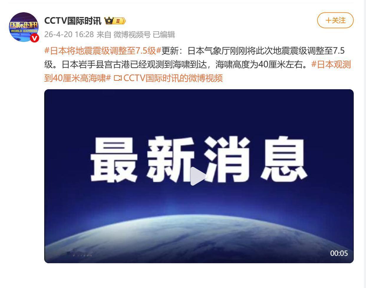 4月20日,据央视新闻直播间报道,当地时间4月20日16时53分,日本三陆附近海