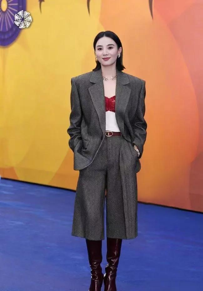 最绝的是内搭,红色蕾丝内衣+白色打底,把性感藏进中性风里,再配酒红色长靴,又酷又媚。这才是真正的“穿搭天花板”,日常想穿得高级,直接抄她作业!