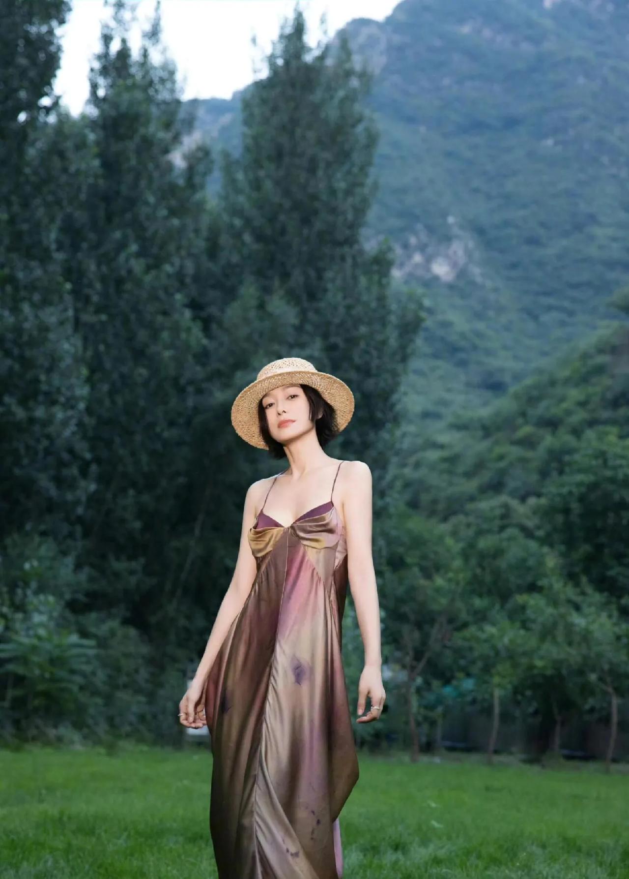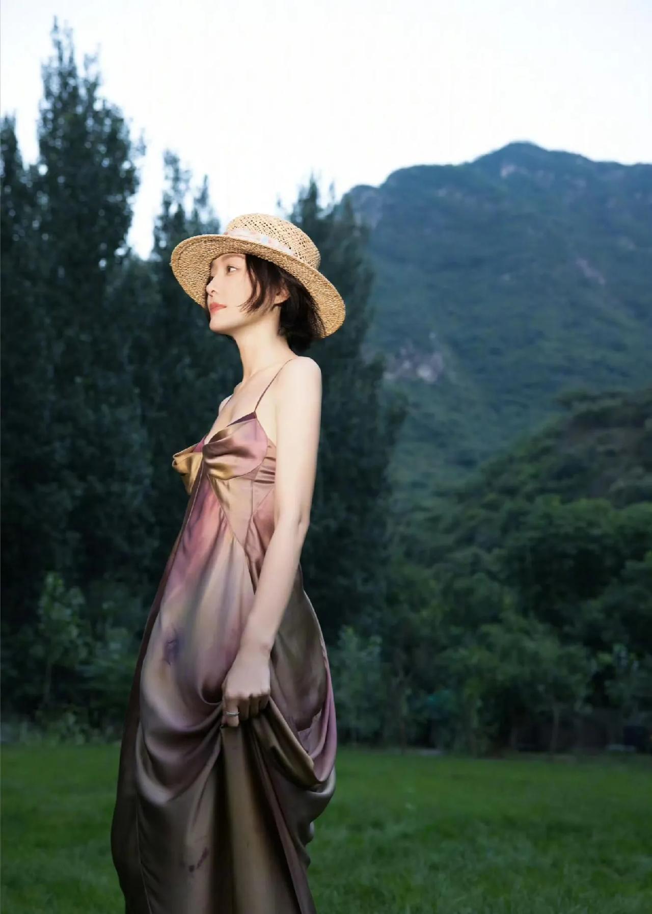 秦岚这穿搭太懂中年女生了!✨ 渐变缎面吊带裙,垂坠感版型遮肉又显瘦,露背设计增加